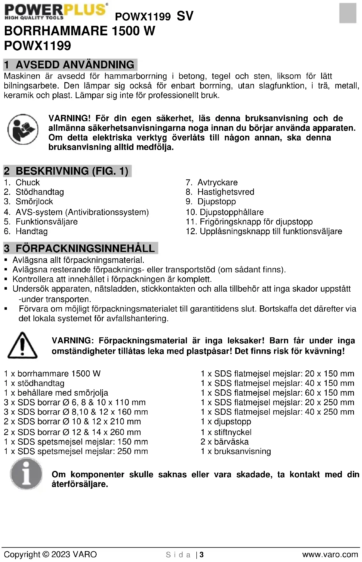- Låt endast kvalificerat fackfolk reparera verktyget med användande av originalreservdelar. Detta för att garantera att verktygets säkerhetsstandards vidmakthålls.POWX1199 SV Copyright © 2023 VARO S i d a | 6 www.varo.com 6 SÄRSKILDA SÄKERHETSFÖRESKRIFTER FÖR BORRHAMMARE
