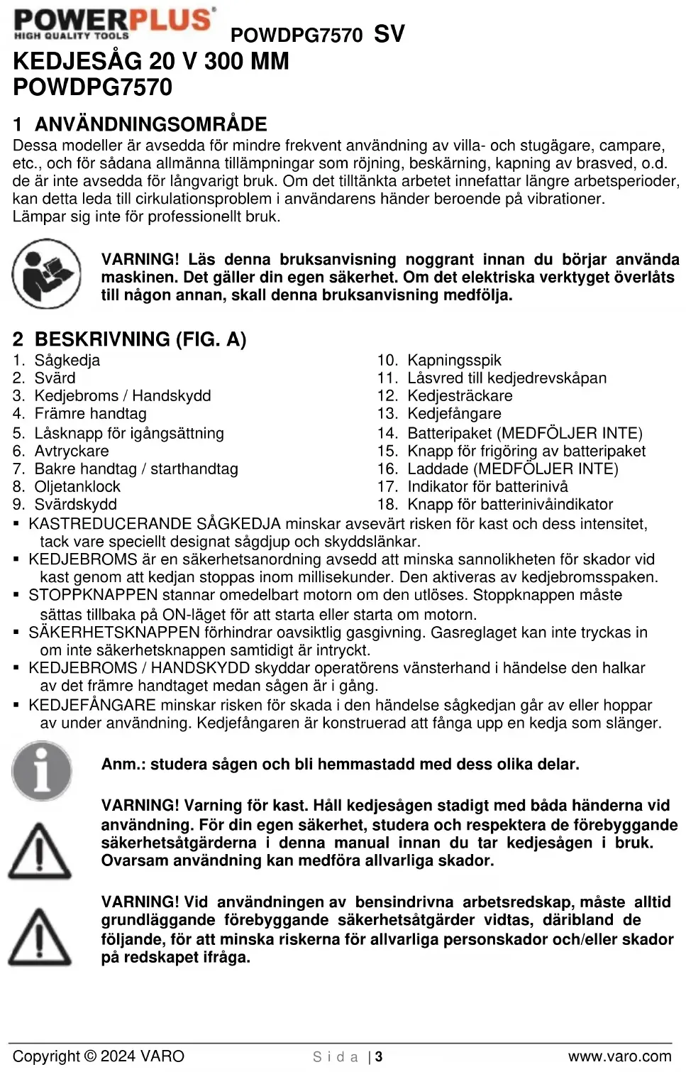 - KEDJEFÅNGARE minskar risken för skada i den händelse sågkedjan går av eller hoppar av under användning. Kedjefångaren är konstruerad att fånga upp en kedja som slänger. Anm.: studera sågen och bli hemmastadd med dess olika delar. VARNING! Varning för kast. Håll kedjesågen stadigt med båda händerna vid användning. För din egen säkerhet, studera och respektera de förebyggande säkerhetsåtgärderna i denna manual innan du tar kedjesågen i bruk. Ovarsam användning kan medföra allvarliga skador. VARNING! Vid användningen av bensindrivna arbetsredskap, måste alltid grundläggande förebyggande säkerhetsåtgärder vidtas, däribland de följande, för att minska riskerna för allvarliga personskador och/eller skador på redskapet ifråga.POWDPG7570 SV Copyright © 2024 VARO S i d a | 4 www.varo.com