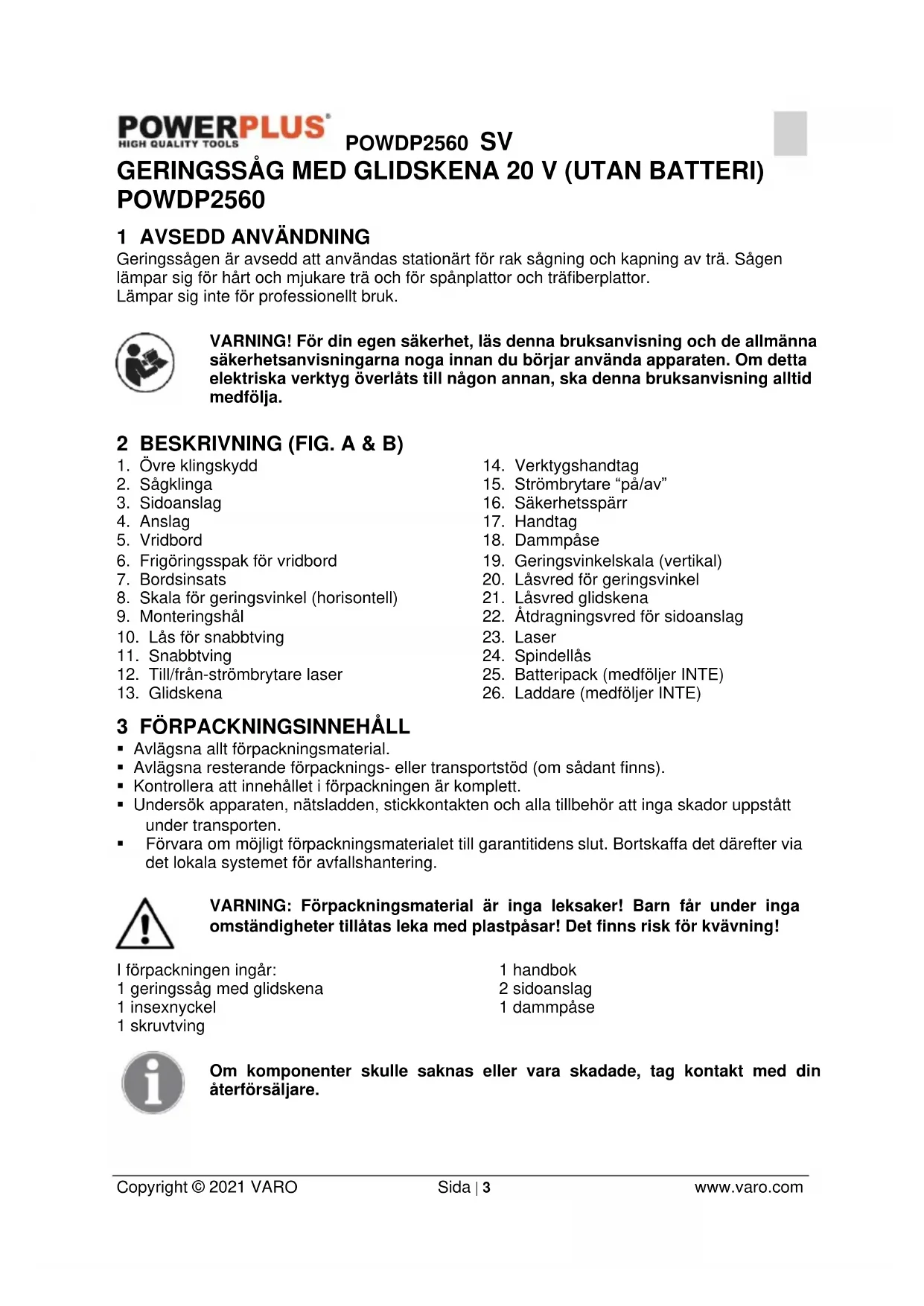 - Böj dig ALDRIG ned över eller kring sågklingan. Ta ALDRIG tag i ett arbetsstycke innan sågklingan står helt stilla.POWDP2560 SV Copyright © 2021 VARO Sida | 7 www.varo.com
