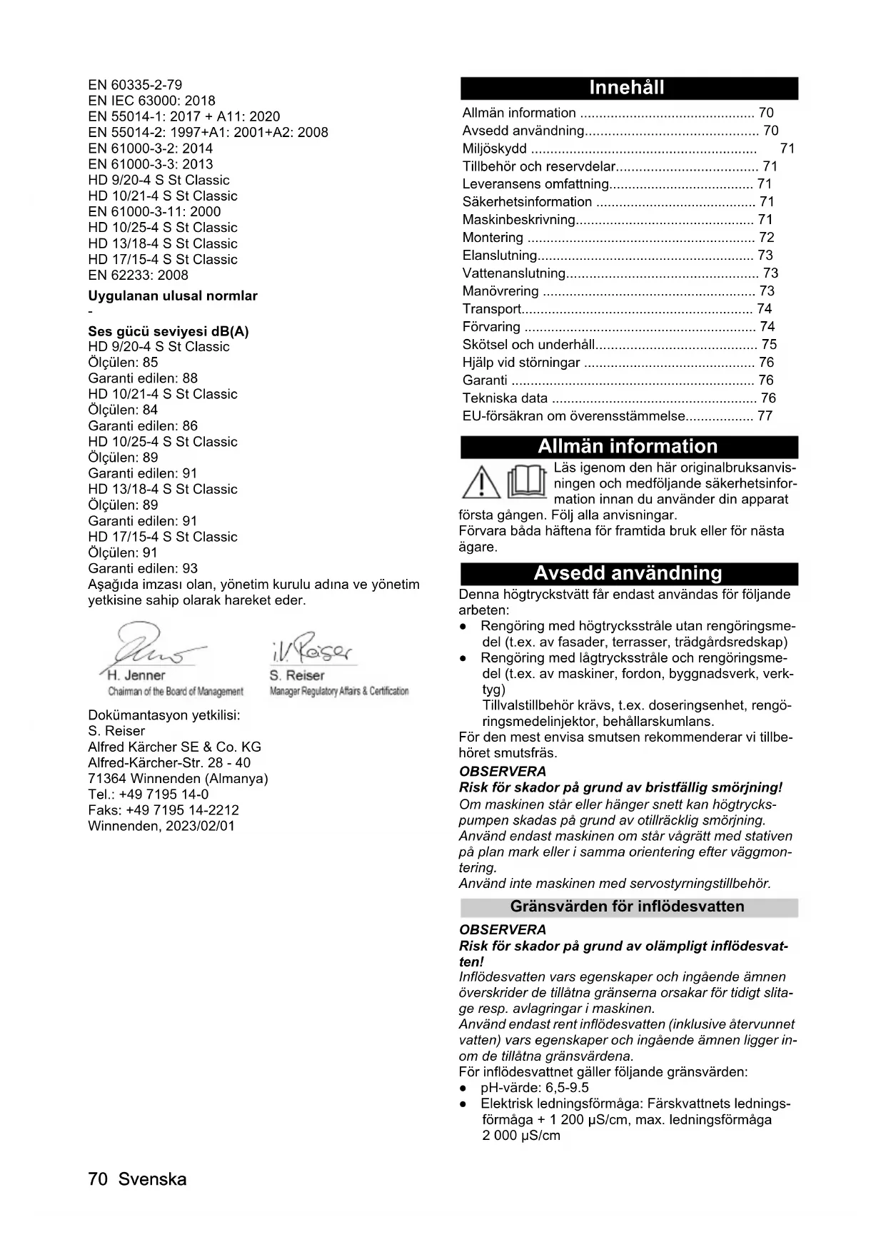 • Ses gücü seviyesi dB(A) HD 9/20-4 S St Classic Ölçülen: 85 Garanti edilen: 88 HD 10/21-4 S St Classic Ölçülen: 84 Garanti edilen: 86 HD 10/25-4 S St Classic Ölçülen: 89 Garanti edilen: 91 HD 13/18-4 S St Classic Ölçülen: 89 Garanti edilen: 91 HD 17/15-4 S St Classic Ölçülen: 91 Garanti edilen: 93 Aşağıda imzası olan, yönetim kurulu adına ve yönetim yetkisine sahip olarak hareket eder. Dokümantasyon yetkilisi: S. Reiser Alfred Kärcher SE & Co. KG Alfred-Kärcher-Str. 28 - 40 71364 Winnenden (Almanya) Tel.: +49 7195 14-0 Faks: +49 7195 14-2212 Winnenden, 2023/02/01 Innehåll Allmän information Läs igenom den här originalbruksanvis- ningen och medföljande säkerhetsinfor- mation innan du använder din apparat första gången. Följ alla anvisningar. Förvara båda häftena för framtida bruk eller för nästa ägare. Avsedd användning Denna högtryckstvätt får endast användas för följande arbeten: ● Rengöring med högtrycksstråle utan rengöringsme- del (t.ex. av fasader, terrasser, trädgårdsredskap) ● Rengöring med lågtrycksstråle och rengöringsme- del (t.ex. av maskiner, fordon, byggnadsverk, verk- tyg) Tillvalstillbehör krävs, t.ex. doseringsenhet, rengö- ringsmedelinjektor, behållarskumlans. För den mest envisa smutsen rekommenderar vi tillbe- höret smutsfräs. OBSERVERA Risk för skador på grund av bristfällig smörjning! Om maskinen står eller hänger snett kan högtrycks- pumpen skadas på grund av otillräcklig smörjning. Använd endast maskinen om står vågrätt med stativen på plan mark eller i samma orientering efter väggmon- tering. Använd inte maskinen med servostyrningstillbehör. Gränsvärden för inflödesvatten OBSERVERA Risk för skador på grund av olämpligt inflödesvat- ten! Inflödesvatten vars egenskaper och ingående ämnen överskrider de tillåtna gränserna orsakar för tidigt slita- ge resp. avlagringar i maskinen. Använd endast rent inflödesvatten (inklusive återvunnet vatten) vars egenskaper och ingående ämnen ligger in- om de tillåtna gränsvärdena. För inflödesvattnet gäller följande gränsvärden: ● pH-värde: 6,5-9.5 ● Elektrisk ledningsförmåga: Färskvattnets lednings- förmåga + 1 200 µS/cm, max. ledningsförmåga 2 000 µS/cm Allmän information p. 70