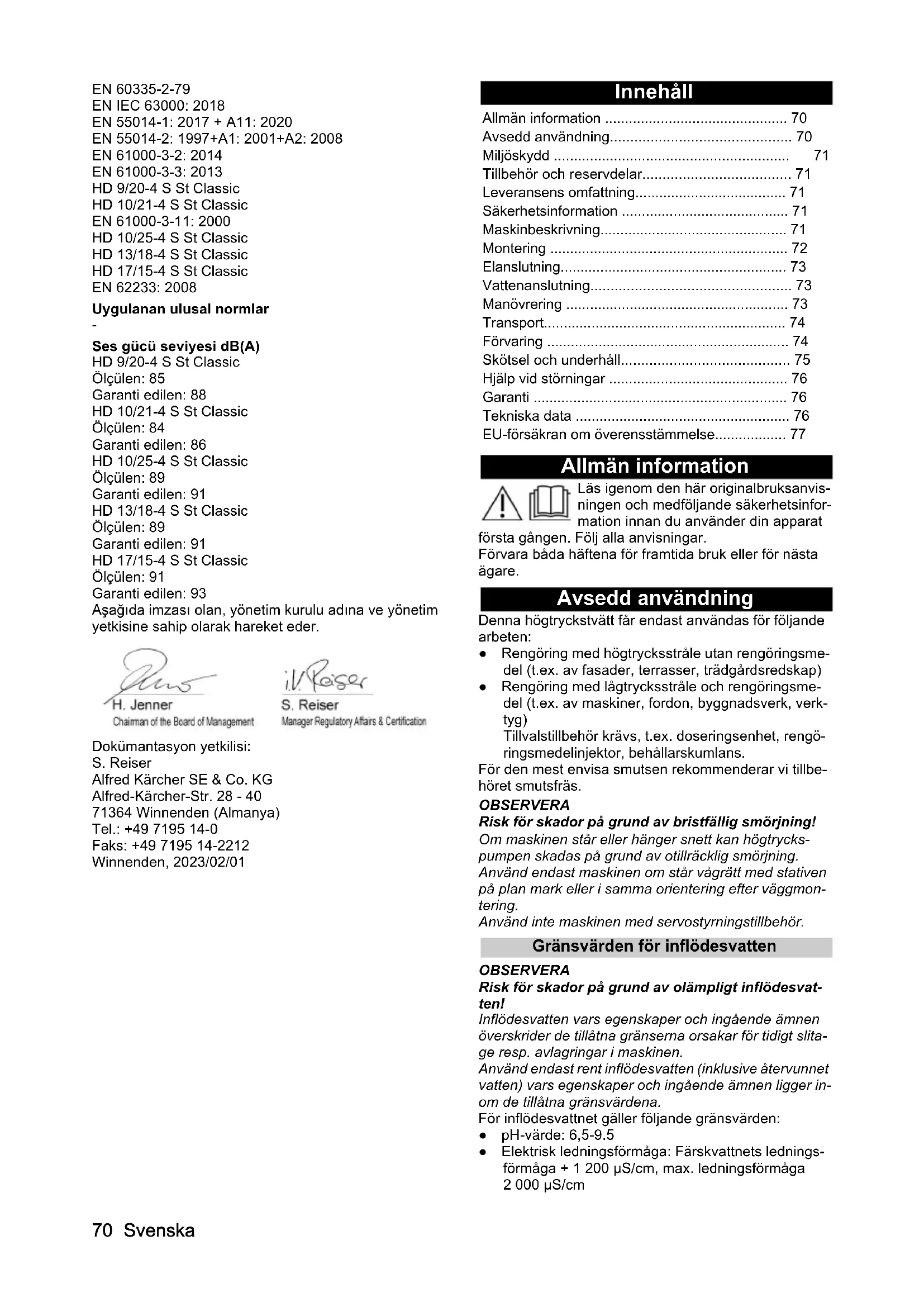- Ses gücü seviyesi dB(A) HD 9/20-4 S St Classic Ölçülen: 85 Garanti edilen: 88 HD 10/21-4 S St Classic Ölçülen: 84 Garanti edilen: 86 HD 10/25-4 S St Classic Ölçülen: 89 Garanti edilen: 91 HD 13/18-4 S St Classic Ölçülen: 89 Garanti edilen: 91 HD 17/15-4 S St Classic Ölçülen: 91 Garanti edilen: 93 Aşağıda imzası olan, yönetim kurulu adına ve yönetim yetkisine sahip olarak hareket eder. Dokümantasyon yetkilisi: S. Reiser Alfred Kärcher SE & Co. KG Alfred-Kärcher-Str. 28 - 40 71364 Winnenden (Almanya) Tel.: +49 7195 14-0 Faks: +49 7195 14-2212 Winnenden, 2023/02/01 Innehåll Allmän information Läs igenom den här originalbruksanvis- ningen och medföljande säkerhetsinfor- mation innan du använder din apparat första gången. Följ alla anvisningar. Förvara båda häftena för framtida bruk eller för nästa ägare. Avsedd användning Denna högtryckstvätt får endast användas för följande arbeten: ● Rengöring med högtrycksstråle utan rengöringsme- del (t.ex. av fasader, terrasser, trädgårdsredskap) ● Rengöring med lågtrycksstråle och rengöringsme- del (t.ex. av maskiner, fordon, byggnadsverk, verk- tyg) Tillvalstillbehör krävs, t.ex. doseringsenhet, rengö- ringsmedelinjektor, behållarskumlans. För den mest envisa smutsen rekommenderar vi tillbe- höret smutsfräs. OBSERVERA Risk för skador på grund av bristfällig smörjning! Om maskinen står eller hänger snett kan högtrycks- pumpen skadas på grund av otillräcklig smörjning. Använd endast maskinen om står vågrätt med stativen på plan mark eller i samma orientering efter väggmon- tering. Använd inte maskinen med servostyrningstillbehör. Gränsvärden för inflödesvatten OBSERVERA Risk för skador på grund av olämpligt inflödesvat- ten! Inflödesvatten vars egenskaper och ingående ämnen överskrider de tillåtna gränserna orsakar för tidigt slita- ge resp. avlagringar i maskinen. Använd endast rent inflödesvatten (inklusive återvunnet vatten) vars egenskaper och ingående ämnen ligger in- om de tillåtna gränsvärdena. För inflödesvattnet gäller följande gränsvärden: ● pH-värde: 6,5-9.5 ● Elektrisk ledningsförmåga: Färskvattnets lednings- förmåga + 1 200 µS/cm, max. ledningsförmåga 2 000 µS/cm Allmän information p. 70