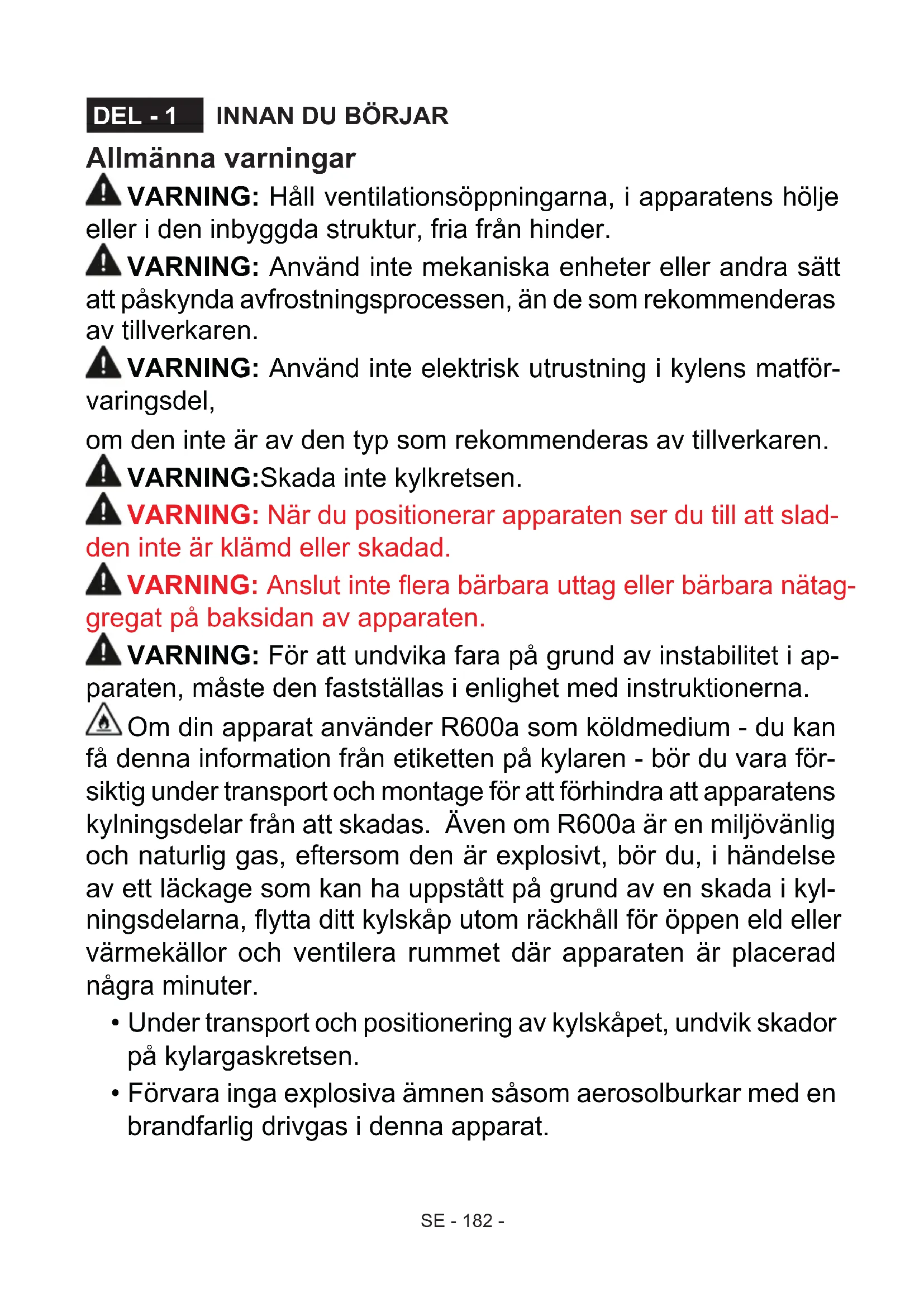 Allmänna varningar VARNING: Håll ventilationsöppningarna, i apparatens hölje eller i den inbyggda struktur, fria från hinder. VARNING: Använd inte mekaniska enheter eller andra sätt att påskynda avfrostningsprocessen, än de som rekommenderas av tillverkaren. VARNING: Använd inte elektrisk utrustning i kylens matför- varingsdel, om den inte är av den typ som rekommenderas av tillverkaren. VARNING:Skada inte kylkretsen. VARNING: När du positionerar apparaten ser du till att slad- den inte är klämd eller skadad. VARNING: Anslut inte era bärbara uttag eller bärbara nätag- gregat på baksidan av apparaten. VARNING: För att undvika fara på grund av instabilitet i ap- paraten, måste den fastställas i enlighet med instruktionerna. Om din apparat använder R600a som köldmedium - du kan få denna information från etiketten på kylaren - bör du vara för- siktig under transport och montage för att förhindra att apparatens kylningsdelar från att skadas. Även om R600a är en miljövänlig och naturlig gas, eftersom den är explosivt, bör du, i händelse av ett läckage som kan ha uppstått på grund av en skada i kyl- ningsdelarna, ytta ditt kylskåp utom räckhåll för öppen eld eller värmekällor och ventilera rummet där apparaten är placerad några minuter.