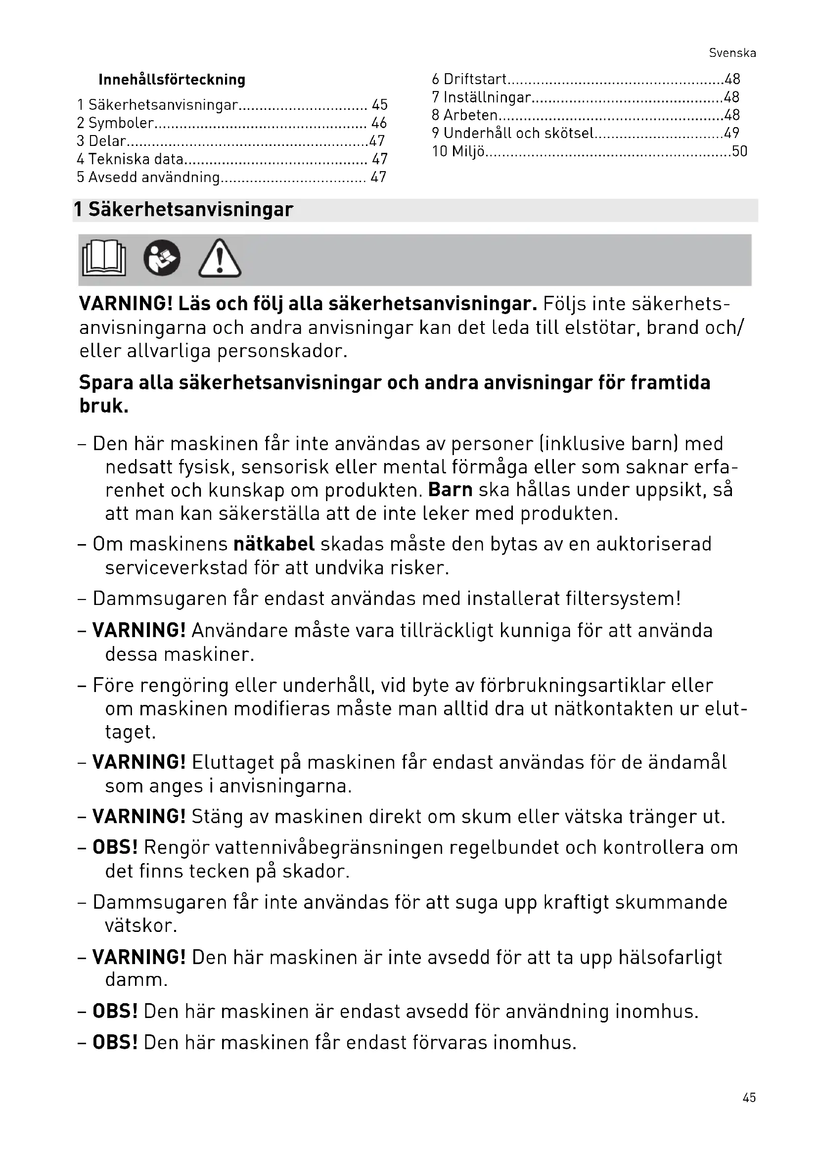- 10 Miljö 1 Säkerhetsanvisningar VARNING! Läs och följ alla säkerhetsanvisningar. Följs inte säkerhets anvisningarna och andra anvisningar kan det leda till elstötar, brand och/ eller allvarliga personskador. Spara alla säkerhetsanvisningar och andra anvisningar för framtida bruk. – Den här maskinen får inte användas av personer (inklusive barn) med nedsatt fysisk, sensorisk eller mental förmåga eller som saknar erfa renhet och kunskap om produkten. Barn ska hållas under uppsikt, så att man kan säkerställa att de inte leker med produkten. – Om maskinens nätkabel skadas måste den bytas av en auktoriserad serviceverkstad för att undvika risker. – Dammsugaren får endast användas med installerat filtersystem! – VARNING! Användare måste vara tillräckligt kunniga för att använda dessa maskiner. – Före rengöring eller underhåll, vid byte av förbrukningsartiklar eller om maskinen modifieras måste man alltid dra ut nätkontakten ur elut taget. – VARNING! Eluttaget på maskinen får endast användas för de ändamål som anges i anvisningarna. – VARNING! Stäng av maskinen direkt om skum eller vätska tränger ut. – OBS! Rengör vattennivåbegränsningen regelbundet och kontrollera om det finns tecken på skador. – Dammsugaren får inte användas för att suga upp kraftigt skummande vätskor. – VARNING! Den här maskinen är inte avsedd för att ta upp hälsofarligt damm. – OBS! Den här maskinen är endast avsedd för användning inomhus. – OBS! Den här maskinen får endast förvaras inomhus. Svenska 45– Explosions- och brandfara! Sug inte upp: – gnistor, glödande partiklar eller varmt damm; – brandfarliga eller explosiva ämnen (t.ex. magnesium, aluminium, bensin, förtunning); – starka ämnen (t.ex. syra, lut, lösningsmedel); – ämnen som kan reagera kemiskt och bilda värme, syror/baser, gaser osv. (exempelvis reaktiva tvåkomponentsmaterial, aluminium och vatten). – Nationella säkerhetsföreskrifter samt materialtillverkarens anvis ningar ska följas! – Får endast användas tillsammans med lämplig skyddsutrustning! – Får endast användas efter att man kontrollerat visuellt att den är hel, i torr miljö och efter instruktion! – Kontrollera kontakten, eluttaget, kabeln och filtret regelbundet för att undvika fara. Skadade elkomponenter måste alltid bytas ut av en auktoriserad serviceverkstad. – Dammsugaren ska endast bäras i det avsedda handtaget. – Får inte lyftas eller transporteras med lyftkrok eller telfer. – Dammsugaren får inte bäras i sugslangsfästet [1-3]! – Ställ maskinen på jämnt underlag och säkra den så att den inte kan rulla iväg. – Denna maskin får inte användas av personer som kan reagera extra känsligt på elstötar (t.ex. personer med pacemaker), eftersom statisk uppladdning av maskinen inte kan uteslutas. – Använd endast originalsugslangen från Festool. – Observera arbetsmiljön och var rädd om dig själv och andra när maskinen transporteras och används. Se till exempel till att ingen kan snubbla på sugslangen eller nätka beln. – Håll förpackningsplasten borta från barn. Det finns risk för kvävning. 2 Symboler Varning för allmän risk Varning för elstötar Läs bruksanvisningen och säkerhets anvisningarna! Kasta den inte i hushållssoporna. Dra ut nätkontakten Använd andningsskydd. Svenska 46Förbjudet att kliva upp Tips, information CE-märkning om överensstämmelse Bruksanvisning 3 Delar [1-1] Eluttag [1-2] Kabel- och tillbehörsdepå [1-3] Sugslangsfäste [1-4] Handtag [1-5] Låsning [1-6] Filterlåda [1-7] Låsklämma [1-8] Utblås [1-9] Smutsbehållare [1-10] Strömbrytare [1-11] MAN-knapp [1-12] Reglage för sugeffekt De angivna bilderna finns i början av bruksan visningen. 4 Tekniska data Dammsugare CT15 CT25 Effekt 350 - 1200W Anslutningseffekt i eluttag max. EU CH, DK p. 50