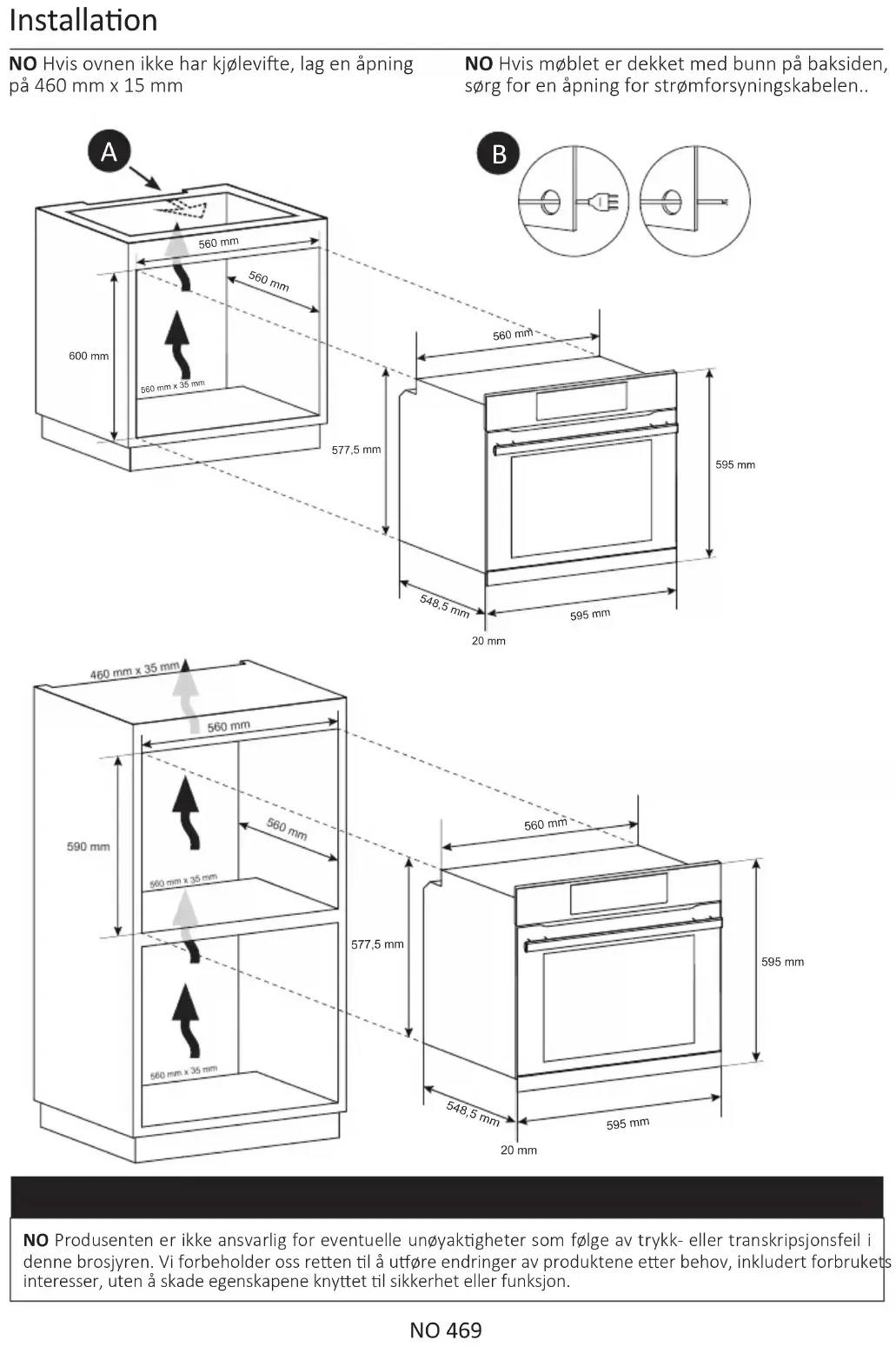SV Om möbeln har en boenskiva på baksidan måste en öppning skapas för strömförsörjningskabeln. SV Om ugnen inte har en kyläkt, skapa en öppning på 460 mm x 15 mm SV Tillverkaren ansvarar inte för eventuella felakgheter ll följd av tryck- eller transkriponsfel i denna broschyr. Vi förbehåller oss räen a uöra modieringar av produkterna eer behov, inklusive konsumonsintressen, utan a det påverkar egenskaperna som rör säkerhet eller funkon.70093977