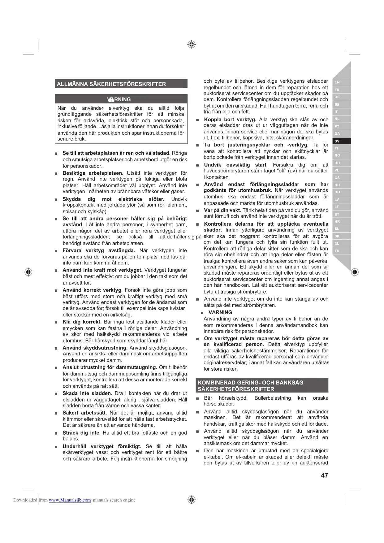ADVARSEL Det angivne niveau for vibrationsemission på denne oplysningsside er blevet målt iht. en standardtest ifølge EN 61029-2-9 og kan bruges til at sammenligne værktøjer indbyrdes. Det kan bruges til en foreløbig eksponeringsvurdering. Det opgivne niveau for vibrationsemission gælder, når værktøjet bruges til sit hovedformål. Men hvis værktøjet bruges til andre formål, med forskelligt eller med dårligt vedligeholdt ekstraudstyr, kan vibrationsemissionen variere. Dette kan medføre en betragtelig stigning i eksponeringsniveauet set over hele arbejdsperioden. Et skøn over niveauet for vibrationseksponering bør også tage højde for de perioder, hvor værktøjet er slukket, eller hvor det er tændt uden faktisk at være i brug. Dette kan medføre en betragtelig reduktion i eksponeringsniveauet set over hele arbejdsperioden. Træf ekstra sikkerhedsforanstaltninger til beskyttelse af operatøren mod virkningerne fra vibrationen som fx: vedligeholde værktøj og ekstraudstyr, holde hænderne varme, organisere arbejdsmønstre. Downloaded from www.Manualslib.com manuals search engineSV VARNING Vibrationsnivåerna som uppges i det här dokumentet har uppmäts i enlighet med ett standardiserat test som beskrivs i EN 61029-2-9 och som kan användas för att jämföra verktyg. Det kan användas som en preliminär bedömning av den vibration som användaren utsätts för. De deklarerade vibrationsvärdena motsvarar de som uppstår när verktyget används i sitt huvudsyfte. Om verktyget används i andra syften, med andra tillbehör eller om verktyget är dåligt underhållet kan vibrationsnivåerna vara annorlunda. Det kan kraftigt öka vibrationsnivåerna över den totala arbetsperioden. En uppskattning av vibrationsnivåerna som användaren utsätts för ska också ta hänsyn till de stunder då verktyget är avstängt och när det går på tomgång. Detta kan kraftigt minska vibrationsnivåerna över den totala arbetsperioden. Andra säkerhetsåtgärder som kan skydda användaren från effekterna av vibrationer är: underhållning av verktyget och tillbehören, hålla händerna varma och organisera arbetssättet.