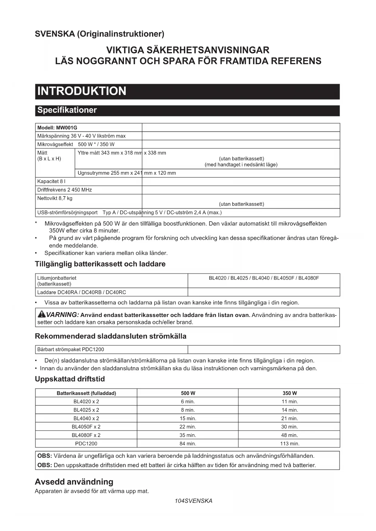 - Pågrundavvårtpågåendeprogramförforskningochutvecklingkandessaspecikationerändrasutanföregå- ende meddelande.• Specikationerkanvarieramellanolikaländer. Tillgänglig batterikassett och laddare Litiumjonbatteriet(batterikassett)BL4020 / BL4025 / BL4040 / BL4050F / BL4080FLaddare DC40RA / DC40RB / DC40RC• Vissaavbatterikassetternaochladdarnapålistanovankanskeintennstillgängligaidinregion. VARNING: Använd endast batterikassetter och laddare från listan ovan. Användning av andra batterikas- setter och laddare kan orsaka personskada och/eller brand. Rekommenderad sladdansluten strömkälla Bärbart strömpaket PDC1200• De(n)sladdanslutnaströmkällan/strömkällornapålistanovankanskeintennstillgängligaidinregion.• Innan du använder den sladdanslutna strömkällan ska du läsa instruktionen och varningsmärkena på den. Uppskattad driftstid Batterikassett (fulladdad) 500 W 350 WBL4020 x 2 6 min. 11 min.BL4025 x 2 8 min. 14 min.BL4040 x 2 15 min. 21 min.BL4050F x 2 22 min. 30 min.BL4080F x 2 35 min. 48 min.PDC1200 84 min. 113 min. OBS: Värdena är ungefärliga och kan variera beroende på laddningsstatus och användningsförhållanden. OBS: Den uppskattade driftstiden med ett batteri är cirka hälften av tiden för användning med två batterier. Avsedd användning Apparaten är avsedd för att värma upp mat.105 SVENSKA Viktiga skyddsåtgärder VARNING: Apparaten får endast underhållas av behörig servicepersonal. Kontakta närmaste aukto- riserade serviceverkstad för granskning, reparation eller justering. VARNING: Försök inte använda apparaten med luckan öppen eftersom en öppen lucka kan resul- tera i skadlig exponering till mikrovågsenergi. VARNING: Om luckan (böjd), gångjärnen (trasiga eller lösa), lucktätningarna eller tätningsytan är skadade får mikrovågsugnen inte användas förrän den har reparerats av en utbildad person. VARNING: Det är farligt för någon annan än en utbildad person att utföra service- eller reparations- arbeten som innebär att skydd som skyddar mot exponering till mikrovågsenergi avlägsnas. VARNING: Använd apparaten endast för dess avsedda användning enligt beskrivningen i denna handbok. VARNING: Använd inte frätande kemikalier eller ångor i denna apparat. VARNING: Denna typ av apparat är särskilt utformad för att värma, laga eller torka mat. Den är inte avsedd för industriell användning eller laboratorieanvändning. VARNING: Vätskor eller annan mat får inte värmas i förseglade behållare eftersom de riskerar att explodera.