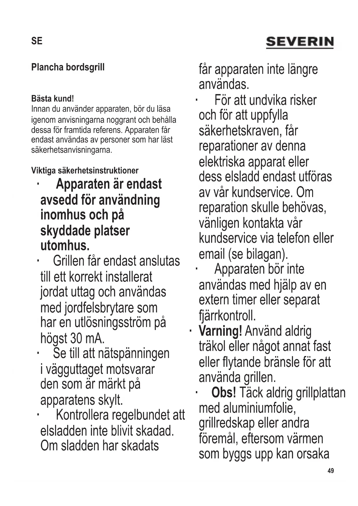 Plancha bordsgrill Bästa kund! Innan du använder apparaten, bör du läsa igenom anvisningarna noggrant och behålla dessa för framtida referens. Apparaten får endast användas av personer som har läst säkerhetsanvisningarna. Viktiga säkerhetsinstruktioner ∙ Apparaten är endast avsedd för användning inomhus och på skyddade platser utomhus. ∙ Grillen får endast anslutas till ett korrekt installerat jordat uttag och användas med jordfelsbrytare som har en utlösningsström på högst 30 mA. ∙ Se till att nätspänningen i vägguttaget motsvarar den som är märkt på apparatens skylt. ∙ Kontrollera regelbundet att elsladden inte blivit skadad. Om sladden har skadats får apparaten inte längre användas. ∙ För att undvika risker och för att uppfylla säkerhetskraven, får reparationer av denna elektriska apparat eller dess elsladd endast utföras av vår kundservice. Om reparation skulle behövas, vänligen kontakta vår kundservice via telefon eller email (se bilagan). ∙ Apparaten bör inte användas med hjälp av en extern timer eller separat fjärrkontroll. ∙ Varning! Använd aldrig träkol eller något annat fast eller ytande bränsle för att använda grillen. ∙ Obs! Täck aldrig grillplattan med aluminiumfolie, grillredskap eller andra föremål, eftersom värmen som byggs upp kan orsaka SE50 104 x 142 mm skador som inte kan repareras på grillen! ∙ Lägg inga vätskor i grillen.