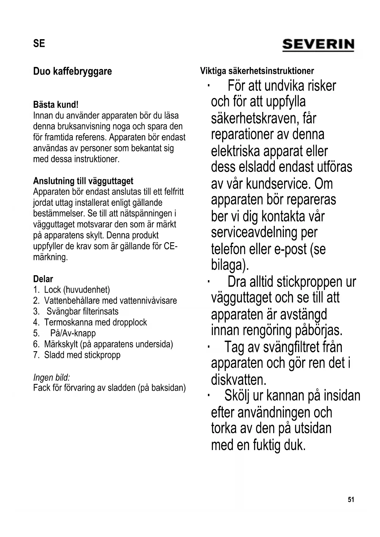 Duo kaffebryggare Bästa kund! Innan du använder apparaten bör du läsa denna bruksanvisning noga och spara den för framtida referens. Apparaten bör endast användas av personer som bekantat sig med dessa instruktioner. Anslutning till vägguttaget Apparaten bör endast anslutas till ett felfritt jordat uttag installerat enligt gällande bestämmelser. Se till att nätspänningen i vägguttaget motsvarar den som är märkt på apparatens skylt. Denna produkt uppfyller de krav som är gällande för CE- märkning. Delar