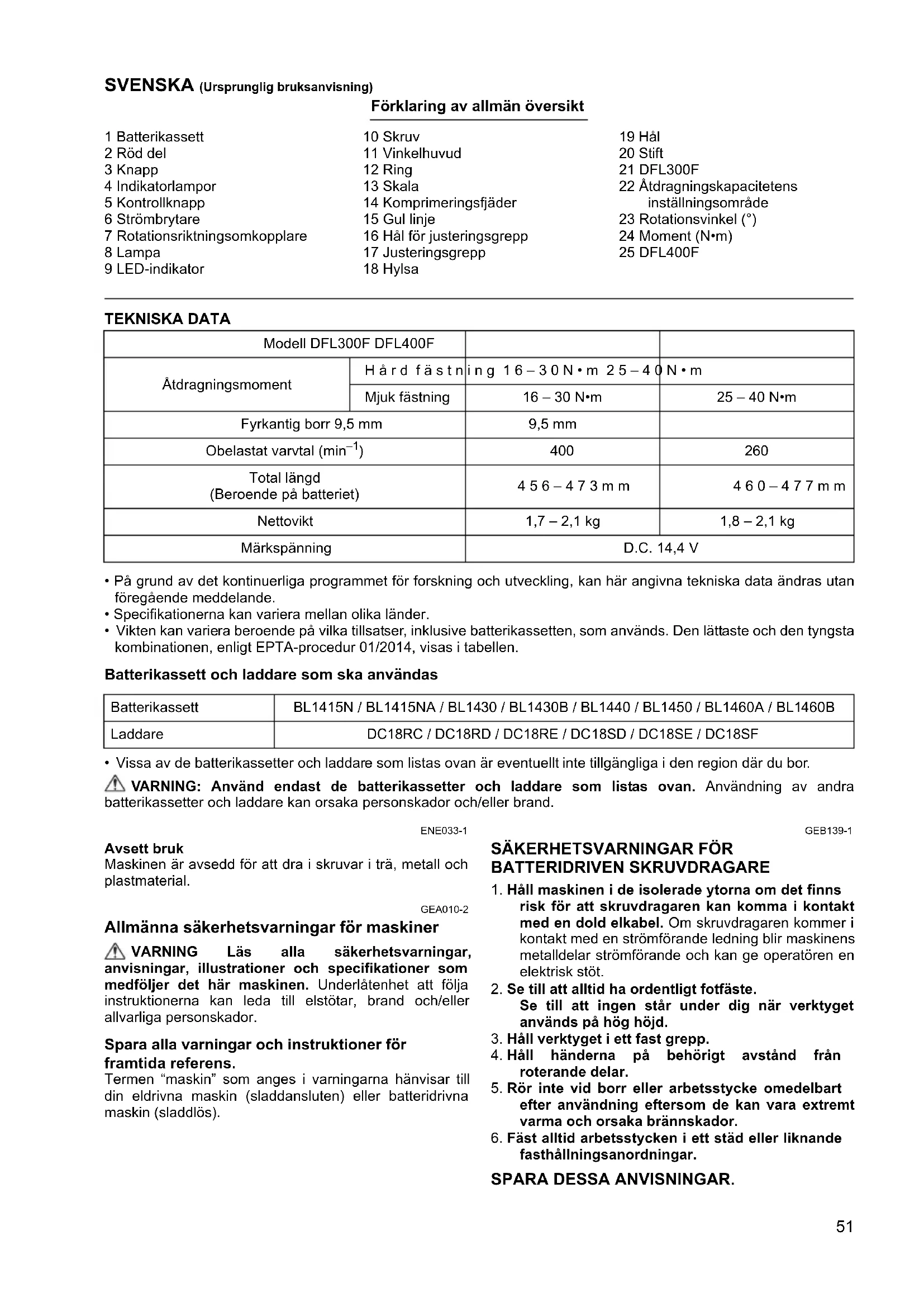 - Vissa av de batterikassetter och laddare som listas ovan är eventuellt inte tillgängliga i den region där du bor. VARNING: Använd endast de batterikassetter och laddare som listas ovan. Användning av andra batterikassetter och laddare kan orsaka personskador och/eller brand. ENE033-1 Avsett bruk Maskinen är avsedd för att dra i skruvar i trä, metall och plastmaterial. GEA010-2 Allmänna säkerhetsvarningar för maskiner VARNING Läs alla säkerhetsvarningar, anvisningar, illustrationer och specifikationer som medföljer det här maskinen. Underlåtenhet att följa instruktionerna kan leda till elstötar, brand och/eller allvarliga personskador. Spara alla varningar och instruktioner för framtida referens. Termen “maskin” som anges i varningarna hänvisar till din eldrivna maskin (sladdansluten) eller batteridrivna maskin (sladdlös). GEB139-1