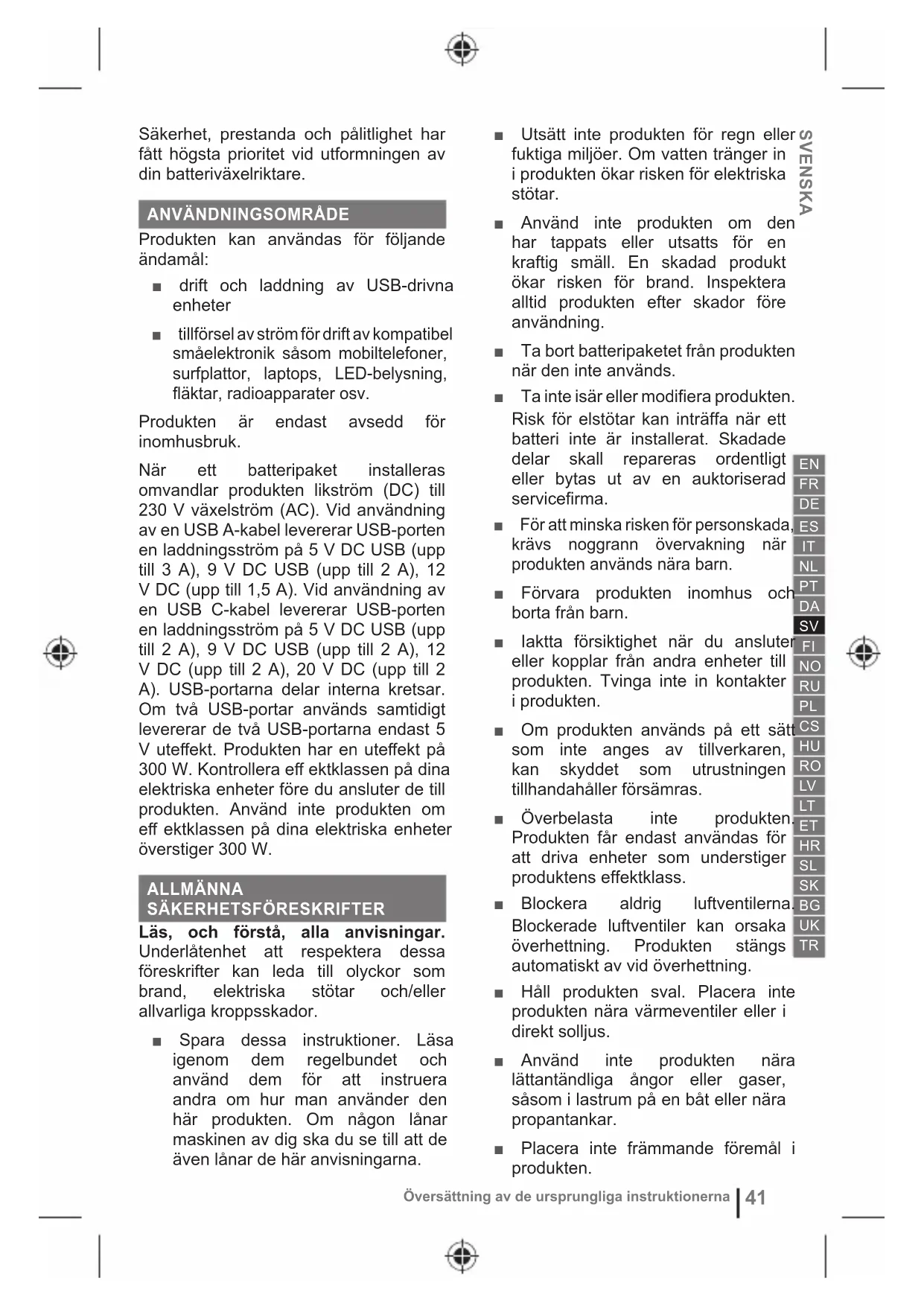 Produkten kan användas för följande ändamål: ■ drift och laddning av USB-drivna enheter ■ tillförsel av ström för drift av kompatibel småelektronik såsom mobiltelefoner, surfplattor, laptops, LED-belysning, fläktar, radioapparater osv. Produkten är endast avsedd för inomhusbruk. När ett batteripaket installeras omvandlar produkten likström (DC) till 230 V växelström (AC). Vid användning av en USB A-kabel levererar USB-porten en laddningsström på 5 V DC USB (upp till 3 A), 9 V DC USB (upp till 2 A), 12 V DC (upp till 1,5 A). Vid användning av en USB C-kabel levererar USB-porten en laddningsström på 5 V DC USB (upp till 2 A), 9 V DC USB (upp till 2 A), 12 V DC (upp till 2 A), 20 V DC (upp till 2 A). USB-portarna delar interna kretsar. Om två USB-portar används samtidigt levererar de två USB-portarna endast 5 V uteff ekt. Produkten har en uteff ekt på 300 W. Kontrollera eff ektklassen på dina elektriska enheter före du ansluter de till produkten. Använd inte produkten om eff ektklassen på dina elektriska enheter överstiger 300 W. ALLMÄNNA