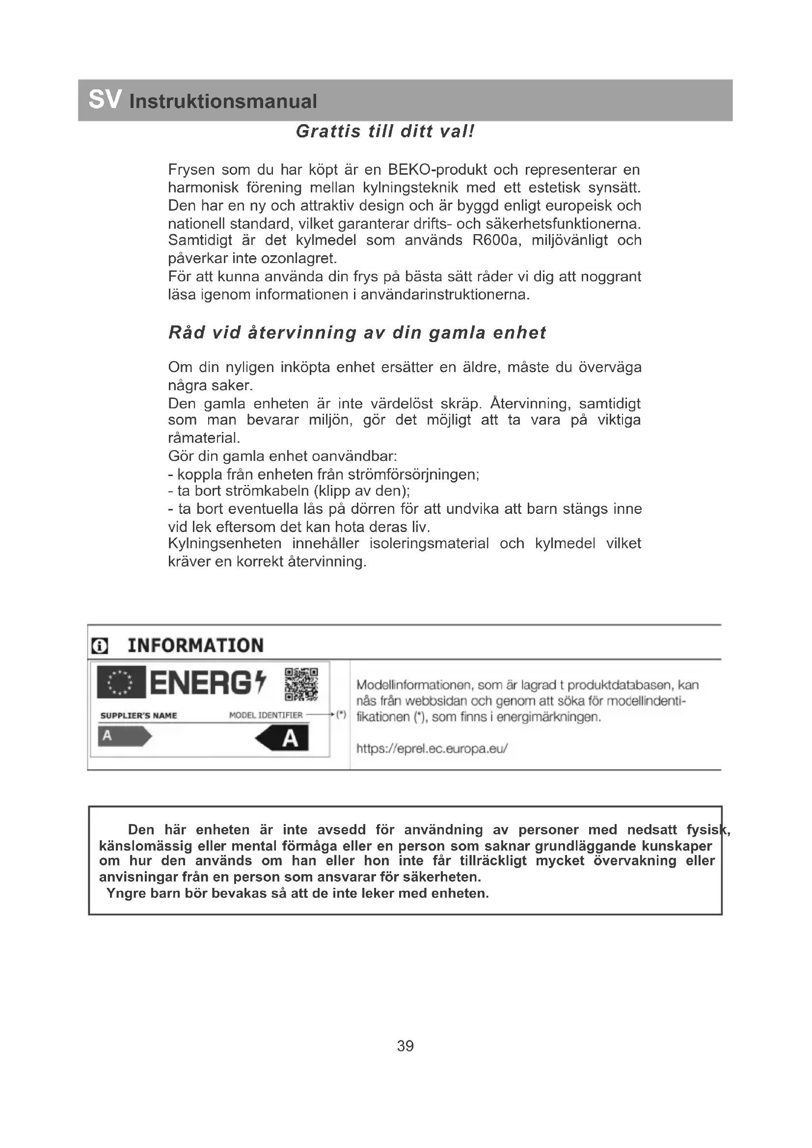 DA Brugsanvisning Symbolet på produktet eller på emballagen angiver, at dette produkt ikke må behandles som husholdningsaffald. I stedet skal det overdrages til det gældende afhentningssted for genbrug af det elektriske og elektroniske udstyr. Ved at sikre at dette produkt bortskaffes korrekt, hjælper du til at forhindre negative konsekvenser for miljøet og den menneskelige sundhed, hvilket ellers kan forårsages af ukorrekt bortskaffelse af dette produkt. For yderligere informationer omkring genbrug af dette produkt bedes du kontakte det lokale kommu nekontor, din lokale genbrugsstation eller butikken, hvor du købte produktet.Grattis till ditt val! Frysen som du har köpt är en BEKO-produkt och representerar en harmonisk förening mellan kylningsteknik med ett estetisk synsätt. Den har en ny och attraktiv design och är byggd enligt europeisk och nationell standard, vilket garanterar drifts- och säkerhetsfunktionerna. Samtidigt är det kylmedel som används R600a, miljövänligt och påverkar inte ozonlagret. För att kunna använda din frys på bästa sätt råder vi dig att noggrant läsa igenom informationen i användarinstruktionerna. Råd vid återvinning av din gamla enhet Om din nyligen inköpta enhet ersätter en äldre, måste du överväga några saker. Den gamla enheten är inte värdelöst skräp. Återvinning, samtidigt som man bevarar miljön, gör det möjligt att ta vara på viktiga råmaterial. Gör din gamla enhet oanvändbar: - koppla från enheten från strömförsörjningen; - ta bort strömkabeln (klipp av den); - ta bort eventuella lås på dörren för att undvika att barn stängs inne vid lek eftersom det kan hota deras liv. Kylningsenheten innehåller isoleringsmaterial och kylmedel vilket kräver en korrekt återvinning.