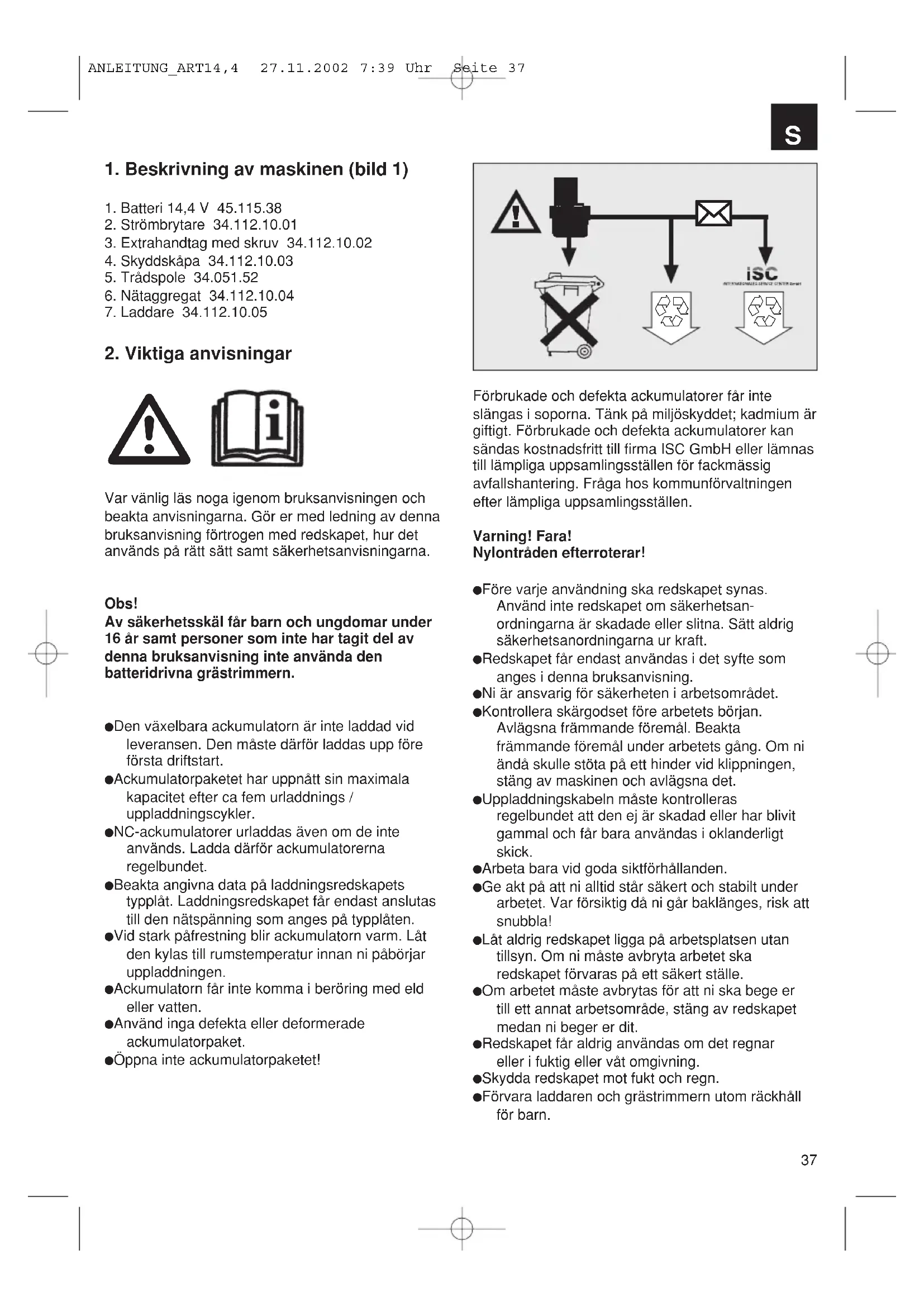 ANLEITUNG_ART14,4 27.11.2002 7:39 Uhr Seite 3637 1. Beskrivning av maskinen (bild 1)1. Batteri 14,4 V 45.115.382. Strömbrytare 34.112.10.013. Extrahandtag med skruv 34.112.10.024. Skyddskåpa 34.112.10.035. Trådspole 34.051.526. Nätaggregat 34.112.10.047. Laddare 34.112.10.052. Viktiga anvisningar Var vänlig läs noga igenom bruksanvisningen ochbeakta anvisningarna. Gör er med ledning av dennabruksanvisning förtrogen med redskapet, hur detanvänds på rätt sätt samt säkerhetsanvisningarna. Obs! Av säkerhetsskäl får barn och ungdomar under16 år samt personer som inte har tagit del avdenna bruksanvisning inte använda denbatteridrivna grästrimmern. Den växelbara ackumulatorn är inte laddad vid leveransen. Den måste därför laddas upp före första driftstart. Ackumulatorpaketet har uppnått sin maximala kapacitet efter ca fem urladdnings / uppladdningscykler. NC-ackumulatorer urladdas även om de inte används. Ladda därför ackumulatorerna regelbundet. Beakta angivna data på laddningsredskapets typplåt. Laddningsredskapet får endast anslutas till den nätspänning som anges på typplåten. Vid stark påfrestning blir ackumulatorn varm. Låt den kylas till rumstemperatur innan ni påbörjar uppladdningen. Ackumulatorn får inte komma i beröring med eld eller vatten. Använd inga defekta eller deformerade ackumulatorpaket. Öppna inte ackumulatorpaketet!Förbrukade och defekta ackumulatorer får inteslängas i soporna. Tänk på miljöskyddet; kadmium ärgiftigt. Förbrukade och defekta ackumulatorer kansändas kostnadsfritt till firma ISC GmbH eller lämnastill lämpliga uppsamlingsställen för fackmässigavfallshantering. Fråga hos kommunförvaltningenefter lämpliga uppsamlingsställen.Varning! Fara!Nylontråden efterroterar! Före varje användning ska redskapet synas. Använd inte redskapet om säkerhetsan-ordningarna är skadade eller slitna. Sätt aldrig säkerhetsanordningarna ur kraft. Redskapet får endast användas i det syfte som anges i denna bruksanvisning. Ni är ansvarig för säkerheten i arbetsområdet. Kontrollera skärgodset före arbetets början. Avlägsna främmande föremål. Beakta främmande föremål under arbetets gång. Om ni ändå skulle stöta på ett hinder vid klippningen, stäng av maskinen och avlägsna det. Uppladdningskabeln måste kontrolleras regelbundet att den ej är skadad eller har blivit gammal och får bara användas i oklanderligt skick. Arbeta bara vid goda siktförhållanden. Ge akt på att ni alltid står säkert och stabilt under arbetet. Var försiktig då ni går baklänges, risk att snubbla! Låt aldrig redskapet ligga på arbetsplatsen utan tillsyn. Om ni måste avbryta arbetet ska redskapet förvaras på ett säkert ställe. Om arbetet måste avbrytas för att ni ska bege er till ett annat arbetsområde, stäng av redskapet medan ni beger er dit. Redskapet får aldrig användas om det regnar eller i fuktig eller våt omgivning. Skydda redskapet mot fukt och regn. Förvara laddaren och grästrimmern utom räckhållför barn.