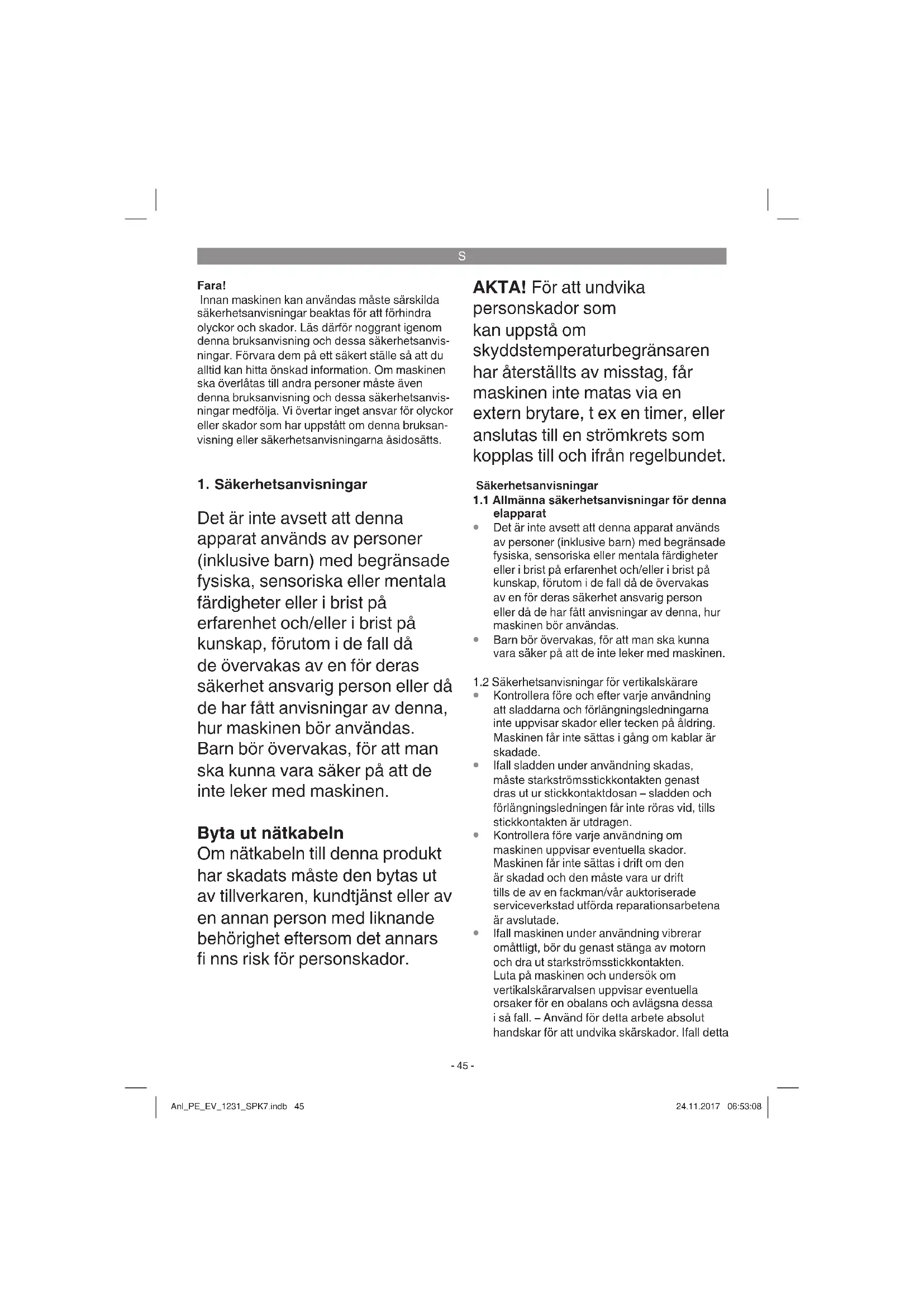 Den överkryssade soptunnan innebär att elektronisk och elektrisk utrustning (WEEE) ska avfallshante- ras separat. Elektrisk och elektronisk utrustning kan innehålla farliga och skadliga ämnen. Dessa verktyg måste lämnas till miljöstation för återvinning av elektronik- och elskrot och får inte slängas i osorterat kommunalt avfall. Genom att göra detta hjälper du till att bevara resurserna och skydda miljön. Kontakta din återförsäljare eller lokala myndigheter för mer information. Låt inte barn leka med plastpåsar eller annat förpackningsmaterial eftersom kvävningsfara och fara för andra skador föreligger. Förvara allt sådant material på säker plats eller lämna till miljövänlig återvinning. Med förbehåll för tekniska ändringar. Anl_PE_EV_1231_SPK7.indb 54Anl_PE_EV_1231_SPK7.indb 54 24.11.2017 06:53:0824.11.2017 06:53:08CZ