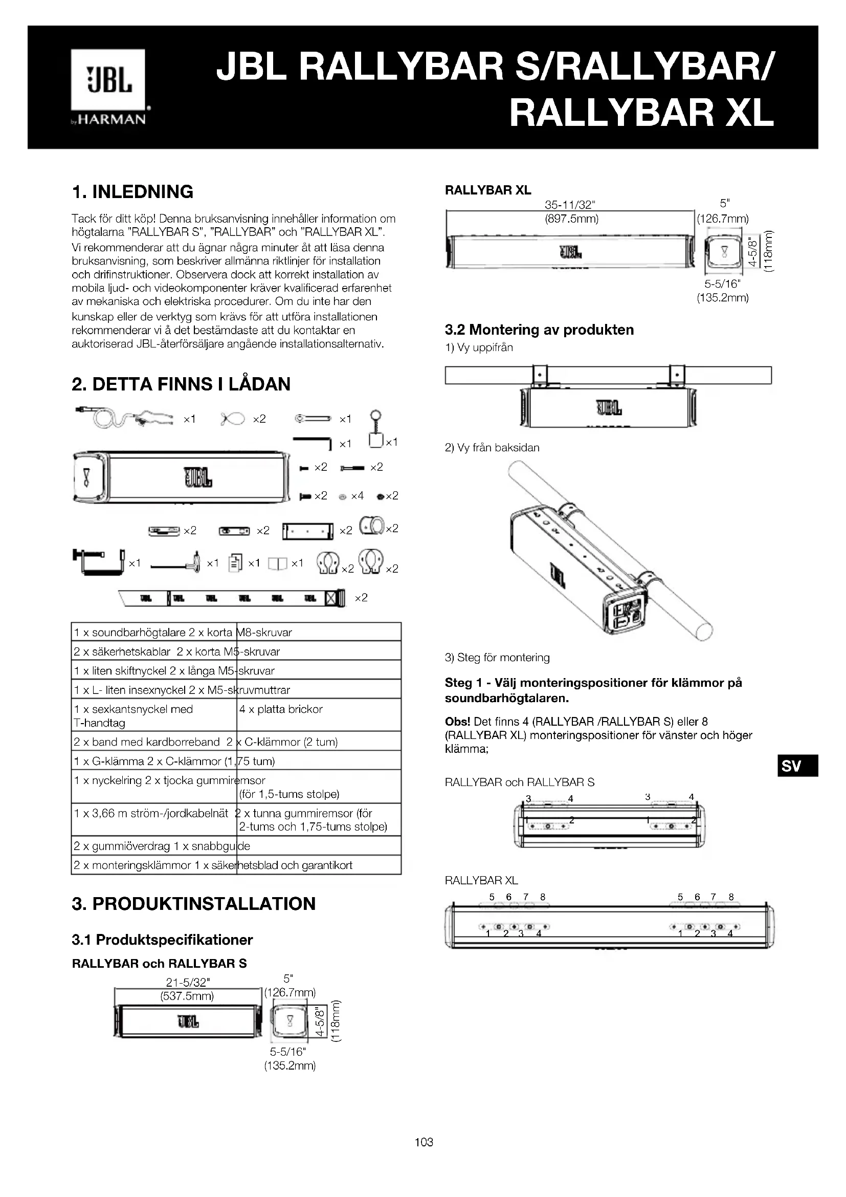 Tack för ditt köp! Denna bruksanvisning innehåller information om högtalarna ”RALLYBAR S”, ”RALLYBAR” och ”RALLYBAR XL”. Vi rekommenderar att du ägnar några minuter åt att läsa denna bruksanvisning, som beskriver allmänna riktlinjer för installation och drifinstruktioner. Observera dock att korrekt installation av mobila ljud- och videokomponenter kräver kvalificerad erfarenhet av mekaniska och elektriska procedurer. Om du inte har den kunskap eller de verktyg som krävs för att utföra installationen rekommenderar vi å det bestämdaste att du kontaktar en auktoriserad JBL-återförsäljare angående installationsalternativ.