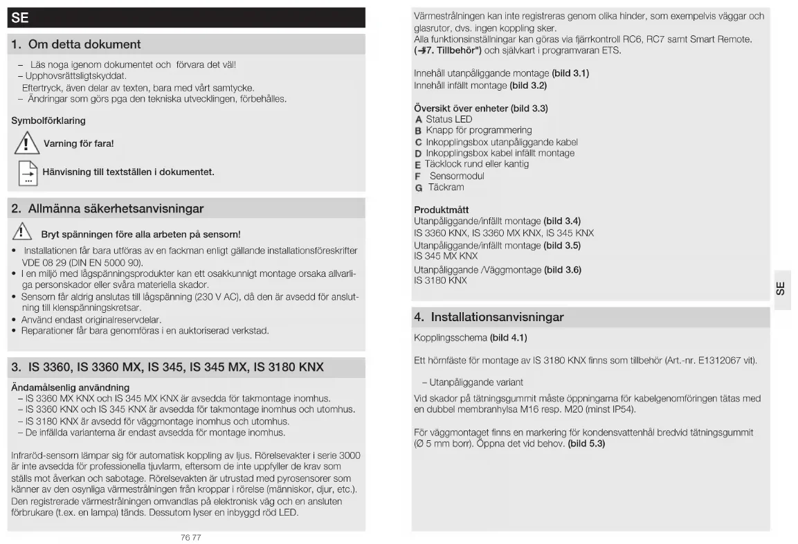 Hänvisning till textställen i dokumentet 2 Allmänna säkerhetsanvisningar Bryt spänningen före alla arbeten på sensorn!• Installationen får bara utföras av en fackman enligt gällande installationsföreskrifter VDE 08 29 (DIN EN 5000 90).• I en miljö med lågspänningsprodukter kan ett osakkunnigt montage orsaka allvarli-ga personskador eller svåra materiella skador.• Sensorn får aldrig anslutas till lågspänning (230 V AC), då den är avsedd för anslut-ning till klenspänningskretsar.• Använd endast originalreservdelar.• Reparationer får bara genomföras i en auktoriserad verkstad. 3 IS3360, IS3360 MX, IS345, IS 345 MX, IS3180 KNX Ändamålsenlig användning – IS3360MXKNX och IS345MXKNX är avsedda för takmontage inomhus. – IS3360KNX och IS345KNX är avsedda för takmontage inomhus och utomhus. – IS3180KNX är avsedd för väggmontage inomhus och utomhus. – De infällda varianterna är endast avsedda för montage inomhus.Infraröd-sensorn lämpar sig för automatisk koppling av ljus. Rörelsevakter i serie 3000 är inte avsedda för professionella tjuvlarm, eftersom de inte uppfyller de krav som ställs mot åverkan och sabotage. Rörelsevakten är utrustad med pyrosensorer som känner av den osynliga värmestrålningen från kroppar i rörelse (människor, djur, etc.). Den registrerade värmestrålningen omvandlas på elektronisk väg och en ansluten förbrukare (t.ex. en lampa) tänds. Dessutom lyser en inbyggd röd LED. Värmestrålningen kan inte registreras genom olika hinder, som exempelvis väggar och glasrutor, dvs. ingen koppling sker. Alla funktionsinställningar kan göras via fjärrkontroll RC6, RC7 samt Smart Remote. ( "7 Tillbehör") och självkart i programvaran ETS.Innehåll utanpåliggande montage (bild 31)Innehåll infällt montage (bild 32)Översikt över enheter (bild 33) Status LED Knapp för programmering Inkopplingsbox utanpåliggande kabel Inkopplingsbox kabel infällt montage Täcklock rund eller kantig Sensormodul TäckramProduktmåttUtanpåliggande/infällt montage (bild34) IS3360 KNX, IS3360 MX KNX, IS345KNXUtanpåliggande/infällt montage (bild35) IS345 MXKNXUtanpåliggande /Väggmontage (bild36) IS3180KNX 4 Installationsanvisningar Kopplingsschema (bild41) Ett hörnfäste för montage av IS3180KNX finns som tillbehör (Art.-nr.E1312067 vit). – Utanpåliggande variantVid skador på tätningsgummit måste öppningarna för kabelgenomföringen tätas med en dubbel membranhylsa M16 resp. M20 (minst IP54).För väggmontaget finns en markering för kondensvattenhål bredvid tätningsgummit (Ø 5mm borr). Öppna det vid behov. (bild 53)