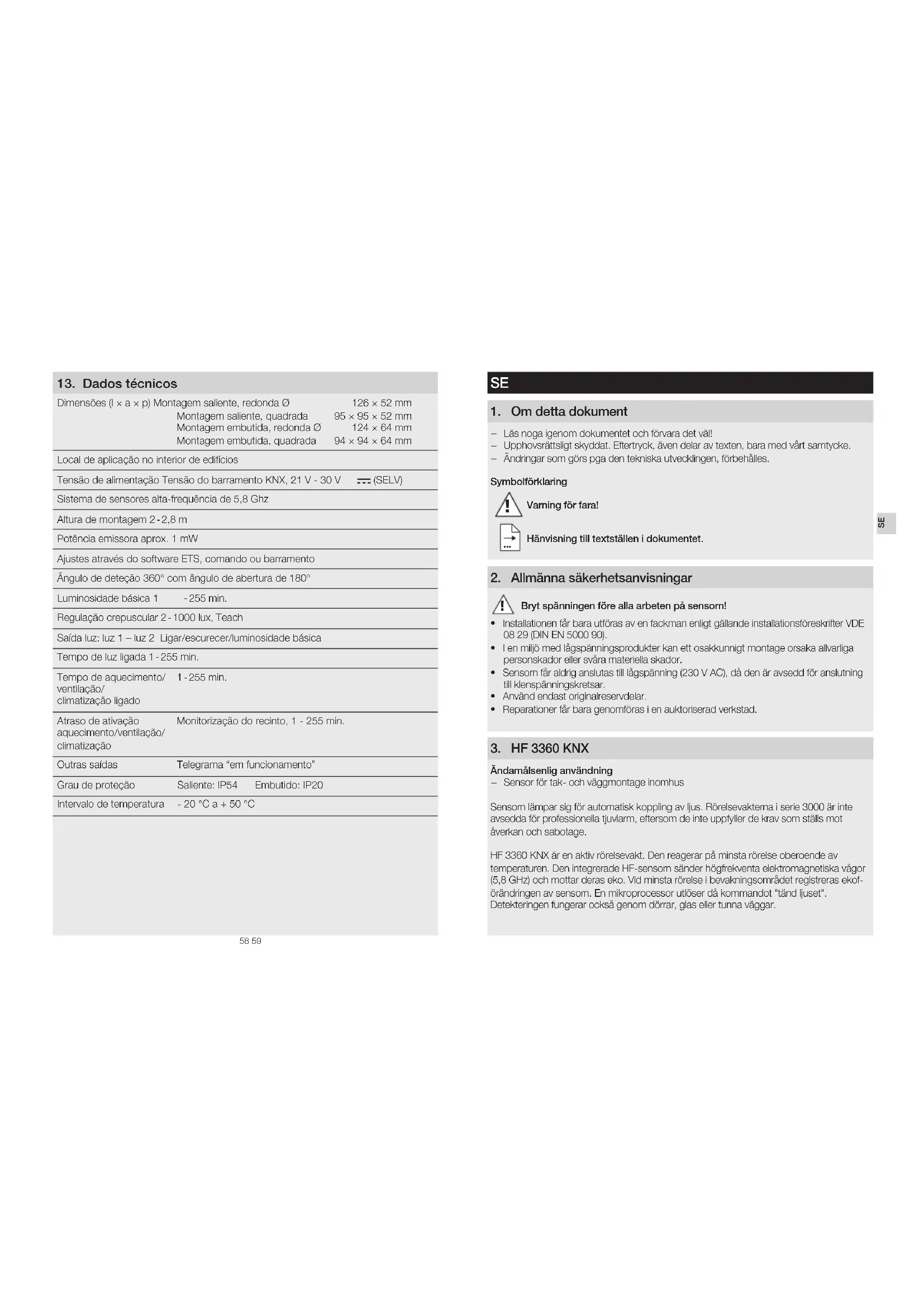 GARANTITILLVERKAR ÅRS GARANTI TILLVERKAR ÅRS GARANTI SE64 65 Mått (L×B×H) Utanpåliggande montage, runt Ø Utanpåliggande montage, kvadratiskt Infällt montage, runt Ø Infällt montage, kvadratiskt 126×52mm 95× 95×52mm 124×64mm 94× 94×64mm Användning Inomhus Matarspänning KNX busspänning, 21 V - 30 V (SELV) Sensorteknik 5,8 GHz högfrekvens Montagehöjd 2 - 2,8m Sändeekt ca 1mW Inställningar via ETS-mjukvara, fjärrkontroll eller BUSS Bevakningsvinkel 360° med 180° öppningsvinkel Grundljusnivå 1 - 255 min Skymningsinställning 2 - 1000Lux, Teach Utgång ljus Ljus 1 - Ljus 2 Koppling/dimring/grundljusnivå Efterlystid belysning 1 - 255 min Efterlystid VVL 1 - 255 min Tillslagsfördröjning VVL Rumsbevakning, 1 - 255 min Ytterligare utgångar I-drift-telegram Skyddsklass Utanpåliggande montage: IP54 Infällt montage: IP20 Temperaturområde - 20°C till + 50°C 13 Tekniska data