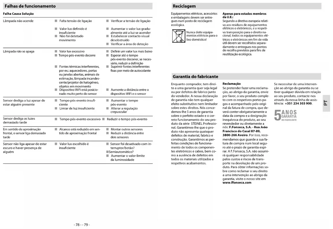 DO FABRICANTEGARANTIA ANOS DO FABRICANTE GARANTIA ANOS DO FABRICANTE Reciclagem Equipamentos elétricos, acessórios e embalagens devem ser entre-gues num posto de reciclagem ecológica. Nunca deite equipa-mentos elétricos para o lixo doméstico!Apenas para estados membros da U.E.:Segundo a diretiva europeia relati-va aos resíduos de equipamentos elétricos e eletrónicos, e a respeti-va transposição para o direito na-cional, todos os equipamentos elé-tricos e eletrónicos em fim de vida útil devem ser recolhidos separa-damente e entregues nos pontos de recolha previstos para fins de reutilização ecológica.- 80 - - 81 - L Innan installation och monta- ge påbörjas måste spänning- en kopplas bort. L Inkoppling måste utföras i spänningsfritt tillstånd. Bryt strömmen och kontrollera med spänningsprovare att al- la parter är spänningslösa. L Eftersom sensorn installeras till nätspänningen måste ar- betet utföras på ett fackman- namässigt sätt och enligt gäl- lande installationsföreskrifter. L Utgång B1 och B2 är ett relä för låg belastning (max. 1A). L På styringång DIM 1-10 V an- sluts armaturer med HF-don som har en analog 1-10V styrsignal för ljusreglering. Produktbeskrivning a Montage-enhet b Sensormodul c Undersida sensor d DIP-switchar (1) Normal / testläge (2) Semi- / helautomatiskt läge (3) tryckknapp / strömbrytare (4) På / På-Av (5) Konstantljus på / konstantljus av e Skymningsinställning f Efterlystid kanal 1 g Eftergångtid kanal 2 h Tillslagsfördröjning kanal 2 i Räckvidd – inställning