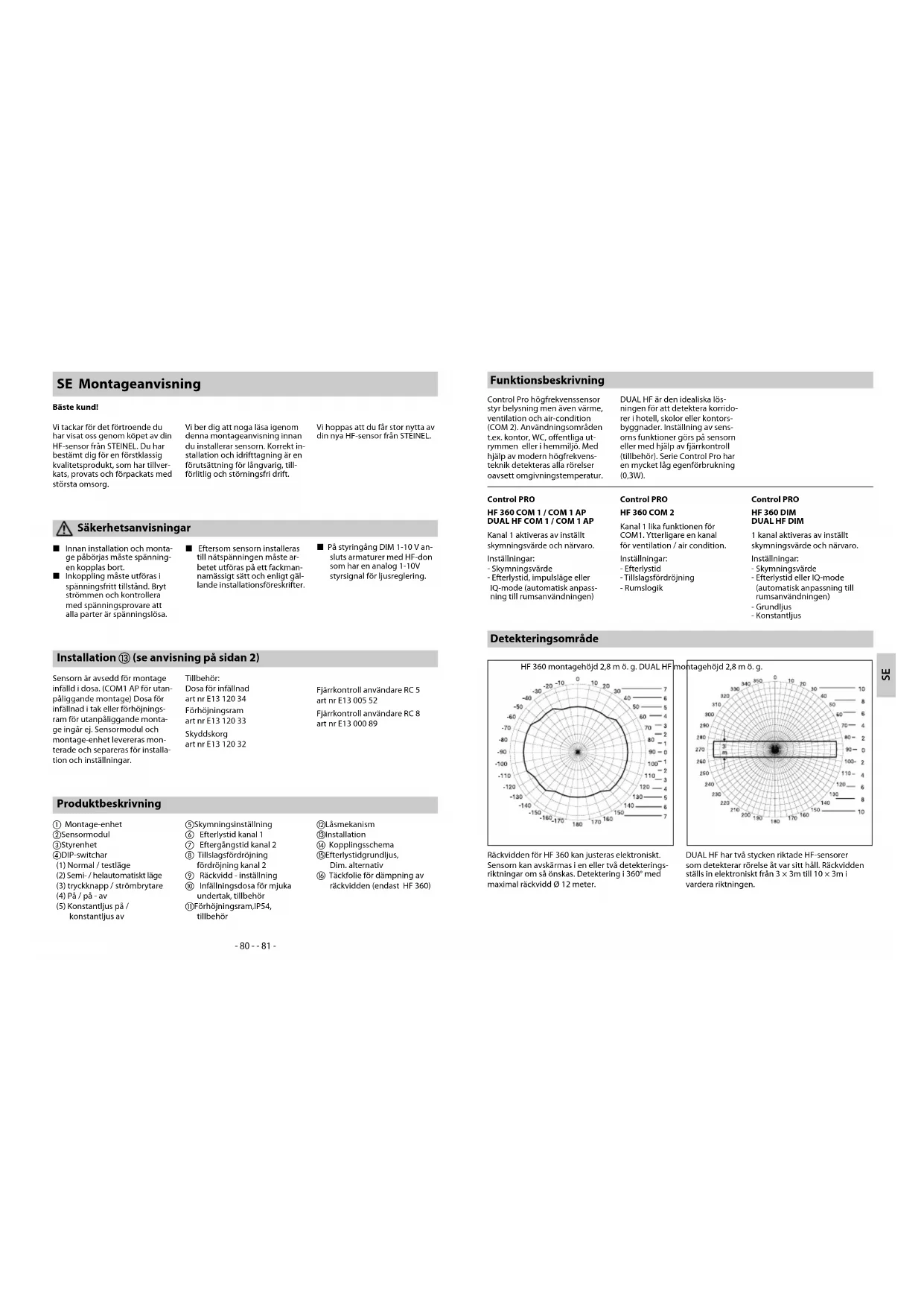 L Innan installation och monta- ge påbörjas måste spänning- en kopplas bort. L Inkoppling måste utföras i spänningsfritt tillstånd. Bryt strömmen och kontrollera med spänningsprovare att alla parter är spänningslösa. L Eftersom sensorn installeras till nätspänningen måste ar- betet utföras på ett fackman- namässigt sätt och enligt gäl- lande installationsföreskrifter. L På styringång DIM 1-10 V an- sluts armaturer med HF-don som har en analog 1-10V styrsignal för ljusreglering. Produktbeskrivning a Montage-enhet b Sensormodul c Styrenhet d DIP-switchar (1) Normal / testläge (2) Semi- / helautomatiskt läge (3) tryckknapp / strömbrytare (4) På / på - av (5) Konstantljus på / konstantljus av e Skymningsinställning f Efterlystid kanal 1 g Eftergångstid kanal 2 h Tillslagsfördröjning fördröjning kanal 2 i Räckvidd - inställning j Infällningsdosa för mjuka undertak, tillbehör k Förhöjningsram, IP 54, tillbehör l Låsmekanism m Installation n Kopplingsschema o Efterlystid grundljus, Dim. alternativ p Täckfolie för dämpning av räckvidden (endast HF 360) Installation m (se anvisning på sidan 2) Sensorn är avsedd för montage infälld i dosa. (COM1 AP för utan- påliggande montage) Dosa för infällnad i tak eller förhöjnings- ram för utanpåliggande monta- ge ingår ej. Sensormodul och montage-enhet levereras mon- terade och separeras för installa- tion och inställningar. Tillbehör: Dosa för infällnad art nr E13 120 34 Förhöjningsram art nr E13 120 33 Skyddskorg art nr E13 120 32 Fjärrkontroll användare RC 5 art nr E13 005 52 Fjärrkontroll användare RC 8 art nr E13 000 89 SE Montageanvisning Bäste kund! Vi tackar för det förtroende du har visat oss genom köpet av din HF-sensor från STEINEL. Du har bestämt dig för en förstklassig kvalitetsprodukt, som har tillver- kats, provats och förpackats med största omsorg. Vi ber dig att noga läsa igenom denna montageanvisning innan du installerar sensorn. Korrekt in- stallation och idrifttagning är en förutsättning för långvarig, till- förlitlig och störningsfri drift. Vi hoppas att du får stor nytta av din nya HF-sensor från STEINEL. Säkerhetsanvisningar Funktionsbeskrivning Control Pro högfrekvenssensor styr belysning men även värme, ventilation och air-condition (COM 2). Användningsområden t.ex. kontor, WC, offentliga ut- rymmen eller i hemmiljö. Med hjälp av modern högfrekvens- teknik detekteras alla rörelser oavsett omgivningstemperatur. DUAL HF är den idealiska lös- ningen för att detektera korrido- rer i hotell, skolor eller kontors- byggnader. Inställning av sens- orns funktioner görs på sensorn eller med hjälp av fjärrkontroll (tillbehör). Serie Control Pro har en mycket låg egenförbrukning (0,3W). Control PRO
