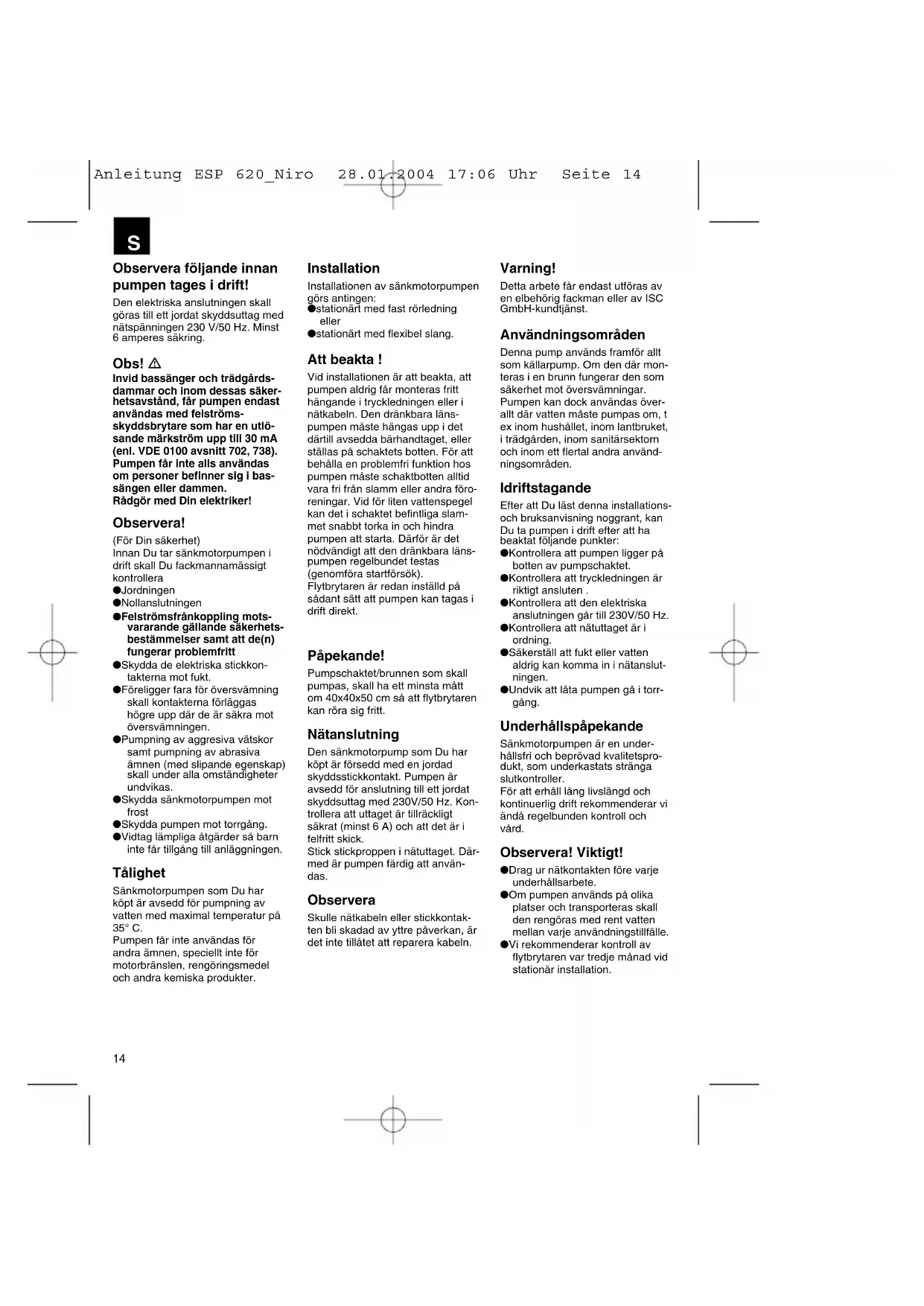Netaansluiting 230 V ~ 50 Hz Opgenomen vermogen 620 Watt Capaciteit max. 17.100 l/h Opvoerhoogte max. 7,5 m Dompeldiepte max. 5 m Watertemperatuur max. 35° C Slangaansluiting 1 1/2” buitendraad Vreemde voorwerpen tot Ø 15 mm Schakelpunthoogte: AAN 50 cm Schakelpunthoogte: UIT 5 cm Artikelnr. : 41.705.09 Technische gegevens Vermogensgegevens Opvoerhoogte Wateropbrengst 1m max.: 16.500 l/h 2m max.: 15.600 l/h 3m max.: 14.400 l/h 4m max.: 12.900 l/h 5m max.: 11.100 l/h 6m max.: 9.000 l/h Anleitung ESP 620_Niro 28.01.2004 17:06 Uhr Seite 1314 Observera följande innan pumpen tages i drift! Den elektriska anslutningen skall göras till ett jordat skyddsuttag med nätspänningen 230 V/50 Hz. Minst 6 amperes säkring. Obs! Invid bassänger och trädgårds- dammar och inom dessas säker- hetsavstånd, får pumpen endast användas med felströms- skyddsbrytare som har en utlö- sande märkström upp till 30 mA (enl. VDE 0100 avsnitt 702, 738). Pumpen får inte alls användas om personer befinner sig i bas- sängen eller dammen. Rådgör med Din elektriker! Observera! (För Din säkerhet) Innan Du tar sänkmotorpumpen i drift skall Du fackmannamässigt kontrollera ● Jordningen ● Nollanslutningen ● Felströmsfrånkoppling mots- vararande gällande säkerhets- bestämmelser samt att de(n) fungerar problemfritt ● Skydda de elektriska stickkon- takterna mot fukt. ● Föreligger fara för översvämning skall kontakterna förläggas högre upp där de är säkra mot översvämningen. ● Pumpning av aggresiva vätskor samt pumpning av abrasiva ämnen (med slipande egenskap) skall under alla omständigheter undvikas. ● Skydda sänkmotorpumpen mot frost ● Skydda pumpen mot torrgång. ● Vidtag lämpliga åtgärder så barn inte får tillgång till anläggningen. Tålighet Sänkmotorpumpen som Du har köpt är avsedd för pumpning av vatten med maximal temperatur på 35° C. Pumpen får inte användas för andra ämnen, speciellt inte för motorbränslen, rengöringsmedel och andra kemiska produkter. Varning! Detta arbete får endast utföras av en elbehörig fackman eller av ISC GmbH-kundtjänst. Användningsområden Denna pump används framför allt som källarpump. Om den där mon- teras i en brunn fungerar den som säkerhet mot översvämningar. Pumpen kan dock användas över- allt där vatten måste pumpas om, t ex inom hushållet, inom lantbruket, i trädgården, inom sanitärsektorn och inom ett flertal andra använd- ningsområden. Idriftstagande Efter att Du läst denna installations- och bruksanvisning noggrant, kan Du ta pumpen i drift efter att ha beaktat följande punkter: ● Kontrollera att pumpen ligger på botten av pumpschaktet. ● Kontrollera att tryckledningen är riktigt ansluten . ● Kontrollera att den elektriska anslutningen går till 230V/50 Hz. ● Kontrollera att nätuttaget är i ordning. ● Säkerställ att fukt eller vatten aldrig kan komma in i nätanslut- ningen. ● Undvik att låta pumpen gå i torr- gång. Underhållspåpekande Sänkmotorpumpen är en under- hållsfri och beprövad kvalitetspro- dukt, som underkastats stränga slutkontroller. För att erhåll lång livslängd och kontinuerlig drift rekommenderar vi ändå regelbunden kontroll och vård. Observera! Viktigt! ● Drag ur nätkontakten före varje underhållsarbete. ● Om pumpen används på olika platser och transporteras skall den rengöras med rent vatten mellan varje användningstillfälle. ● Vi rekommenderar kontroll av flytbrytaren var tredje månad vid stationär installation. Installation Installationen av sänkmotorpumpen görs antingen: ● stationärt med fast rörledning eller ● stationärt med flexibel slang. Att beakta ! Vid installationen är att beakta, att pumpen aldrig får monteras fritt hängande i tryckledningen eller i nätkabeln. Den dränkbara läns- pumpen måste hängas upp i det därtill avsedda bärhandtaget, eller ställas på schaktets botten. För att behålla en problemfri funktion hos pumpen måste schaktbotten alltid vara fri från slamm eller andra föro- reningar. Vid för liten vattenspegel kan det i schaktet befintliga slam- met snabbt torka in och hindra pumpen att starta. Därför är det nödvändigt att den dränkbara läns- pumpen regelbundet testas (genomföra startförsök). Flytbrytaren är redan inställd på sådant sätt att pumpen kan tagas i drift direkt. Påpekande! Pumpschaktet/brunnen som skall pumpas, skall ha ett minsta mått om 40x40x50 cm så att flytbrytaren kan röra sig fritt. Nätanslutning Den sänkmotorpump som Du har köpt är försedd med en jordad skyddsstickkontakt. Pumpen är avsedd för anslutning till ett jordat skyddsuttag med 230V/50 Hz. Kon- trollera att uttaget är tillräckligt säkrat (minst 6 A) och att det är i felfritt skick. Stick stickproppen i nätuttaget. Där- med är pumpen färdig att använ- das. Observera Skulle nätkabeln eller stickkontak- ten bli skadad av yttre påverkan, är det inte tillåtet att reparera kabeln.