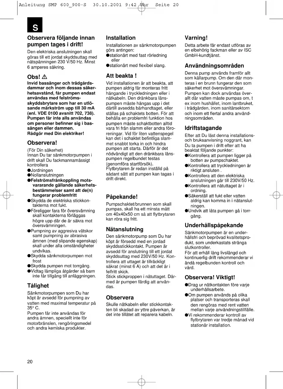 Ligação à rede 230 V c.a., 50 Hz 230 V c.a., 50 Hz Consumo de corrente 600 watts 900 watts Caudal máx. 13.800 l/h 15.000 l/h Altura de elevação máx. 8 m 9,5 m Profund. de imersão máx. 5 m 5 m Temperatura da água máx. 35°C 35°C Conexão de mangueira 5/4” rosca externa 5/4” rosca externa Corpos internos de até Ø 25 mm Ø 25 mm Nível de conexão: 50 cm 50 cm Nível de desconexão 5 cm 5 cm Art. No. 41.708.40 41.708.50 Dados técnicos Dados sobre a potência Altura de retorno Caudal SMP 600-S Caudal SMP 900-S 1m max.: 13.500 l/h max.: 14.400 l/h 2m max.: 12.600 l/h max.: 13.200 l/h 3m max.: 10.800 l/h max.: 12.000 l/h 4m max.: 9.000 l/h max.: 10.800 l/h 5m max.: 7.200 l/h max.: 9.000 l/h 6m max.: 6.000 l/h max.: 7.800 l/h Anleitung SMP 600_900-S 30.10.2001 9:42 Uhr Seite 1920 Observera följande innan pumpen tages i drift! Den elektriska anslutningen skall göras till ett jordat skyddsuttag med nätspänningen 230 V/50 Hz. Minst 6 amperes säkring. Obs! Invid bassänger och trädgårds- dammar och inom dessas säker- hetsavstånd, får pumpen endast användas med felströms- skyddsbrytare som har en utlö- sande märkström upp till 30 mA (enl. VDE 0100 avsnitt 702, 738). Pumpen får inte alls användas om personer befinner sig i bas- sängen eller dammen. Rådgör med Din elektriker! Observera! (För Din säkerhet) Innan Du tar sänkmotorpumpen i drift skall Du fackmannamässigt kontrollera ● Jordningen ● Nollanslutningen ● Felströmsfrånkoppling mots- vararande gällande säkerhets- bestämmelser samt att de(n) fungerar problemfritt ● Skydda de elektriska stickkon- takterna mot fukt. ● Föreligger fara för översvämning skall kontakterna förläggas högre upp där de är säkra mot översvämningen. ● Pumpning av aggresiva vätskor samt pumpning av abrasiva ämnen (med slipande egenskap) skall under alla omständigheter undvikas. ● Skydda sänkmotorpumpen mot frost ● Skydda pumpen mot torrgång. ● Vidtag lämpliga åtgärder så barn inte får tillgång till anläggningen. Tålighet Sänkmotorpumpen som Du har köpt är avsedd för pumpning av vatten med maximal temperatur på 35° C. Pumpen får inte användas för andra ämnen, speciellt inte för motorbränslen, rengöringsmedel och andra kemiska produkter. Varning! Detta arbete får endast utföras av en elbehörig fackman eller av ISC GmbH-kundtjänst. Användningsområden Denna pump används framför allt som källarpump. Om den där mon- teras i en brunn fungerar den som säkerhet mot översvämningar. Pumpen kan dock användas över- allt där vatten måste pumpas om, t ex inom hushållet, inom lantbruket, i trädgården, inom sanitärsektorn och inom ett flertal andra använd- ningsområden. Idriftstagande Efter att Du läst denna installations- och bruksanvisning noggrant, kan Du ta pumpen i drift efter att ha beaktat följande punkter: ● Kontrollera att pumpen ligger på botten av pumpschaktet. ● Kontrollera att tryckledningen är riktigt ansluten . ● Kontrollera att den elektriska anslutningen går till 230V/50 Hz. ● Kontrollera att nätuttaget är i ordning. ● Säkerställ att fukt eller vatten aldrig kan komma in i nätanslut- ningen. ● Undvik att låta pumpen gå i torr- gång. Underhållspåpekande Sänkmotorpumpen är en under- hållsfri och beprövad kvalitetspro- dukt, som underkastats stränga slutkontroller. För att erhåll lång livslängd och kontinuerlig drift rekommenderar vi ändå regelbunden kontroll och vård. Observera! Viktigt! ● Drag ur nätkontakten före varje underhållsarbete. ● Om pumpen används på olika platser och transporteras skall den rengöras med rent vatten mellan varje användningstillfälle. ● Vi rekommenderar kontroll av flytbrytaren var tredje månad vid stationär installation. Installation Installationen av sänkmotorpumpen görs antingen: ● stationärt med fast rörledning eller ● stationärt med flexibel slang. Att beakta ! Vid installationen är att beakta, att pumpen aldrig får monteras fritt hängande i tryckledningen eller i nätkabeln. Den dränkbara läns- pumpen måste hängas upp i det därtill avsedda bärhandtaget, eller ställas på schaktets botten. För att behålla en problemfri funktion hos pumpen måste schaktbotten alltid vara fri från slamm eller andra föro- reningar. Vid för liten vattenspegel kan det i schaktet befintliga slam- met snabbt torka in och hindra pumpen att starta. Därför är det nödvändigt att den dränkbara läns- pumpen regelbundet testas (genomföra startförsök). Flytbrytaren är redan inställd på sådant sätt att pumpen kan tagas i drift direkt. Påpekande! Pumpschaktet/brunnen som skall pumpas, skall ha ett minsta mått om 40x40x50 cm så att flytbrytaren kan röra sig fritt. Nätanslutning Den sänkmotorpump som Du har köpt är försedd med en jordad skyddsstickkontakt. Pumpen är avsedd för anslutning till ett jordat skyddsuttag med 230V/50 Hz. Kon- trollera att uttaget är tillräckligt säkrat (minst 6 A) och att det är i felfritt skick. Stick stickproppen i nätuttaget. Där- med är pumpen färdig att använ- das. Observera Skulle nätkabeln eller stickkontak- ten bli skadad av yttre påverkan, är det inte tillåtet att reparera kabeln.