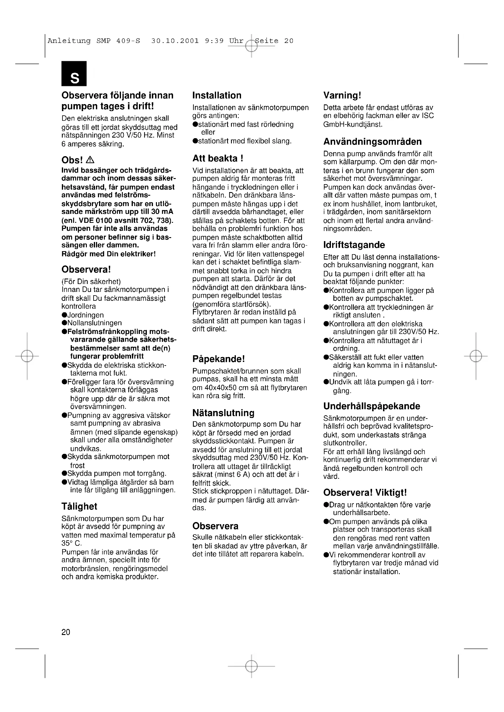 Ligação à rede 230 V c.a., 50 Hz Consumo de corrente 400 watts Caudal máx. 9.000 l/h Altura de elevação máx. 5 m Profund. de imersão máx. 5 m Temperatura da água máx. 35°C Conexão de mangueira 5/4” AG Corpos internos de até Ø 20 mm Nível de conexão: 50 cm Nível de desconexão 5 cm Art. No. 41.705.40 Dados técnicos Dados sobre a potência Altura de retorno Caudal SMP 409-S 2m max.: 7.000 l/h 3m max.: 5.500 l/h 4m max.: 3.000 l/h Anleitung SMP 409-S 30.10.2001 9:39 Uhr Seite 1920 Observera följande innan pumpen tages i drift! Den elektriska anslutningen skall göras till ett jordat skyddsuttag med nätspänningen 230 V/50 Hz. Minst 6 amperes säkring. Obs! Invid bassänger och trädgårds- dammar och inom dessas säker- hetsavstånd, får pumpen endast användas med felströms- skyddsbrytare som har en utlö- sande märkström upp till 30 mA (enl. VDE 0100 avsnitt 702, 738). Pumpen får inte alls användas om personer befinner sig i bas- sängen eller dammen. Rådgör med Din elektriker! Observera! (För Din säkerhet) Innan Du tar sänkmotorpumpen i drift skall Du fackmannamässigt kontrollera ● Jordningen ● Nollanslutningen ● Felströmsfrånkoppling mots- vararande gällande säkerhets- bestämmelser samt att de(n) fungerar problemfritt ● Skydda de elektriska stickkon- takterna mot fukt. ● Föreligger fara för översvämning skall kontakterna förläggas högre upp där de är säkra mot översvämningen. ● Pumpning av aggresiva vätskor samt pumpning av abrasiva ämnen (med slipande egenskap) skall under alla omständigheter undvikas. ● Skydda sänkmotorpumpen mot frost ● Skydda pumpen mot torrgång. ● Vidtag lämpliga åtgärder så barn inte får tillgång till anläggningen. Tålighet Sänkmotorpumpen som Du har köpt är avsedd för pumpning av vatten med maximal temperatur på 35° C. Pumpen får inte användas för andra ämnen, speciellt inte för motorbränslen, rengöringsmedel och andra kemiska produkter. Varning! Detta arbete får endast utföras av en elbehörig fackman eller av ISC GmbH-kundtjänst. Användningsområden Denna pump används framför allt som källarpump. Om den där mon- teras i en brunn fungerar den som säkerhet mot översvämningar. Pumpen kan dock användas över- allt där vatten måste pumpas om, t ex inom hushållet, inom lantbruket, i trädgården, inom sanitärsektorn och inom ett flertal andra använd- ningsområden. Idriftstagande Efter att Du läst denna installations- och bruksanvisning noggrant, kan Du ta pumpen i drift efter att ha beaktat följande punkter: ● Kontrollera att pumpen ligger på botten av pumpschaktet. ● Kontrollera att tryckledningen är riktigt ansluten . ● Kontrollera att den elektriska anslutningen går till 230V/50 Hz. ● Kontrollera att nätuttaget är i ordning. ● Säkerställ att fukt eller vatten aldrig kan komma in i nätanslut- ningen. ● Undvik att låta pumpen gå i torr- gång. Underhållspåpekande Sänkmotorpumpen är en under- hållsfri och beprövad kvalitetspro- dukt, som underkastats stränga slutkontroller. För att erhåll lång livslängd och kontinuerlig drift rekommenderar vi ändå regelbunden kontroll och vård. Observera! Viktigt! ● Drag ur nätkontakten före varje underhållsarbete. ● Om pumpen används på olika platser och transporteras skall den rengöras med rent vatten mellan varje användningstillfälle. ● Vi rekommenderar kontroll av flytbrytaren var tredje månad vid stationär installation. Installation Installationen av sänkmotorpumpen görs antingen: ● stationärt med fast rörledning eller ● stationärt med flexibel slang. Att beakta ! Vid installationen är att beakta, att pumpen aldrig får monteras fritt hängande i tryckledningen eller i nätkabeln. Den dränkbara läns- pumpen måste hängas upp i det därtill avsedda bärhandtaget, eller ställas på schaktets botten. För att behålla en problemfri funktion hos pumpen måste schaktbotten alltid vara fri från slamm eller andra föro- reningar. Vid för liten vattenspegel kan det i schaktet befintliga slam- met snabbt torka in och hindra pumpen att starta. Därför är det nödvändigt att den dränkbara läns- pumpen regelbundet testas (genomföra startförsök). Flytbrytaren är redan inställd på sådant sätt att pumpen kan tagas i drift direkt. Påpekande! Pumpschaktet/brunnen som skall pumpas, skall ha ett minsta mått om 40x40x50 cm så att flytbrytaren kan röra sig fritt. Nätanslutning Den sänkmotorpump som Du har köpt är försedd med en jordad skyddsstickkontakt. Pumpen är avsedd för anslutning till ett jordat skyddsuttag med 230V/50 Hz. Kon- trollera att uttaget är tillräckligt säkrat (minst 6 A) och att det är i felfritt skick. Stick stickproppen i nätuttaget. Där- med är pumpen färdig att använ- das. Observera Skulle nätkabeln eller stickkontak- ten bli skadad av yttre påverkan, är det inte tillåtet att reparera kabeln.