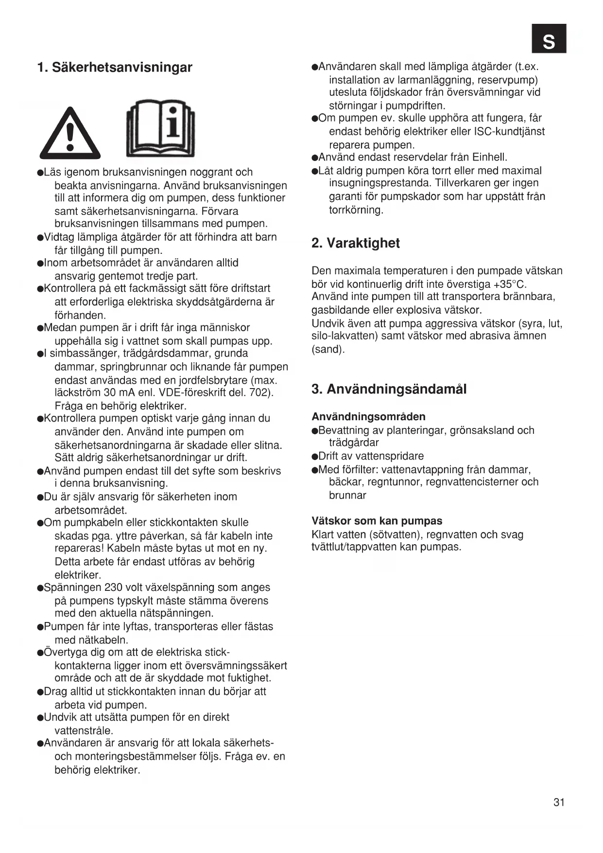 Läs igenom bruksanvisningen noggrant och beakta anvisningarna. Använd bruksanvisningen till att informera dig om pumpen, dess funktioner samt säkerhetsanvisningarna. Förvara bruksanvisningen tillsammans med pumpen. Vidtag lämpliga åtgärder för att förhindra att barn får tillgång till pumpen. Inom arbetsområdet är användaren alltid ansvarig gentemot tredje part. Kontrollera på ett fackmässigt sätt före driftstart att erforderliga elektriska skyddsåtgärderna är förhanden. Medan pumpen är i drift får inga människor uppehålla sig i vattnet som skall pumpas upp. I simbassänger, trädgårdsdammar, grunda dammar, springbrunnar och liknande får pumpen endast användas med en jordfelsbrytare (max. läckström 30 mA enl. VDE-föreskrift del. 702). Fråga en behörig elektriker. Kontrollera pumpen optiskt varje gång innan du använder den. Använd inte pumpen om säkerhetsanordningarna är skadade eller slitna. Sätt aldrig säkerhetsanordningar ur drift. Använd pumpen endast till det syfte som beskrivs i denna bruksanvisning. Du är själv ansvarig för säkerheten inom arbetsområdet. Om pumpkabeln eller stickkontakten skulle skadas pga. yttre påverkan, så får kabeln inte repareras! Kabeln måste bytas ut mot en ny. Detta arbete får endast utföras av behörig elektriker. Spänningen 230 volt växelspänning som anges på pumpens typskylt måste stämma överens med den aktuella nätspänningen. Pumpen får inte lyftas, transporteras eller fästas med nätkabeln. Övertyga dig om att de elektriska stick- kontakterna ligger inom ett översvämningssäkert område och att de är skyddade mot fuktighet. Drag alltid ut stickkontakten innan du börjar att arbeta vid pumpen. Undvik att utsätta pumpen för en direkt vattenstråle. Användaren är ansvarig för att lokala säkerhets- och monteringsbestämmelser följs. Fråga ev. en behörig elektriker. Användaren skall med lämpliga åtgärder (t.ex. installation av larmanläggning, reservpump) utesluta följdskador från översvämningar vid störningar i pumpdriften. Om pumpen ev. skulle upphöra att fungera, får endast behörig elektriker eller ISC-kundtjänst reparera pumpen. Använd endast reservdelar från Einhell. Låt aldrig pumpen köra torrt eller med maximal insugningsprestanda. Tillverkaren ger ingen garanti för pumpskador som har uppstått från torrkörning.