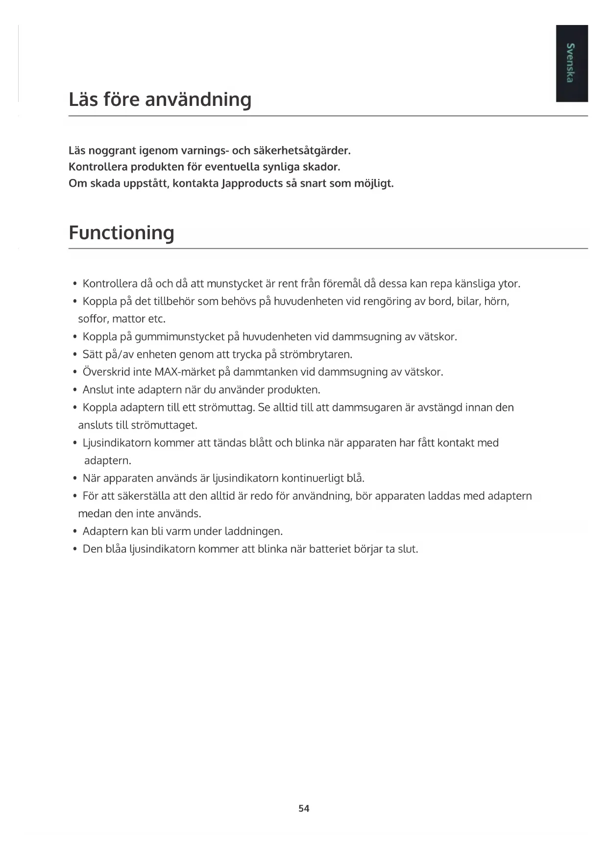 Läs före användning Functioning Läs noggrant igenom varnings- och säkerhetsåtgärder. Kontrollera produkten för eventuella synliga skador. Om skada uppstått, kontakta Japproducts så snart som möjligt.