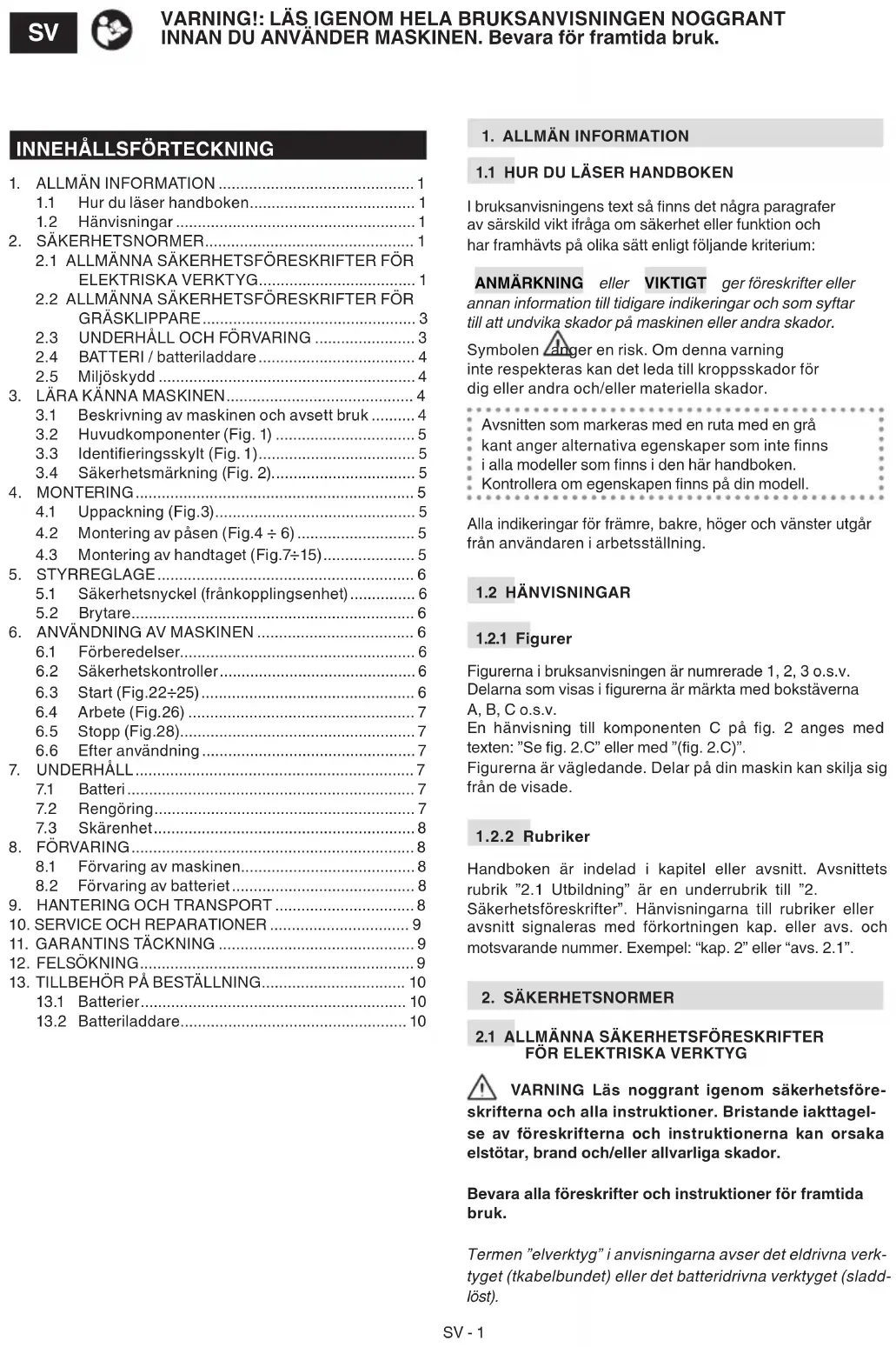 VARNING Läs noggrant igenom säkerhetsföre- skrifterna och alla instruktioner. Bristande iakttagel- se av föreskrifterna och instruktionerna kan orsaka elstötar, brand och/eller allvarliga skador. Bevara alla föreskrifter och instruktioner för framtida bruk. Termen ”elverktyg” i anvisningarna avser det eldrivna verk- tyget (tkabelbundet) eller det batteridrivna verktyget (sladd- löst). VARNING!: LÄS IGENOM HELA BRUKSANVISNINGEN NOGGRANT INNAN DU ANVÄNDER MASKINEN. Bevara för framtida bruk.