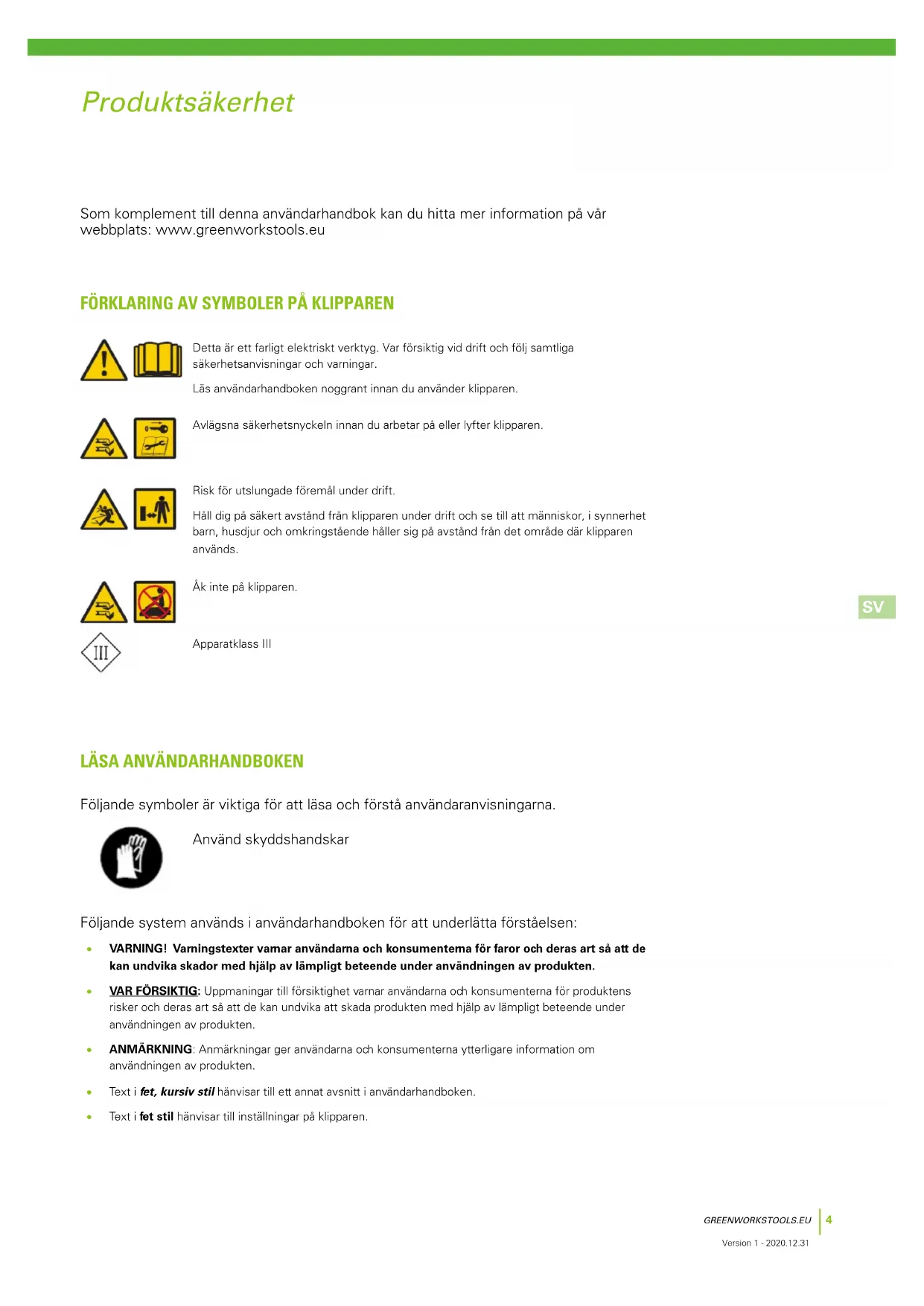 Detta är ett farligt elektriskt verktyg. Var försiktig vid drift och följ samtliga säkerhetsanvisningar och varningar. Läs användarhandboken noggrant innan du använder klipparen. Avlägsna säkerhetsnyckeln innan du arbetar på eller lyfter klipparen. Risk för utslungade föremål under drift. Håll dig på säkert avstånd från klipparen under drift och se till att människor, i synnerhet barn, husdjur och omkringstående håller sig på avstånd från det område där klipparen används. Åk inte på klipparen. Apparatklass III Som komplement till denna användarhandbok kan du hitta mer information på vår webbplats: www.greenworkstools.eu