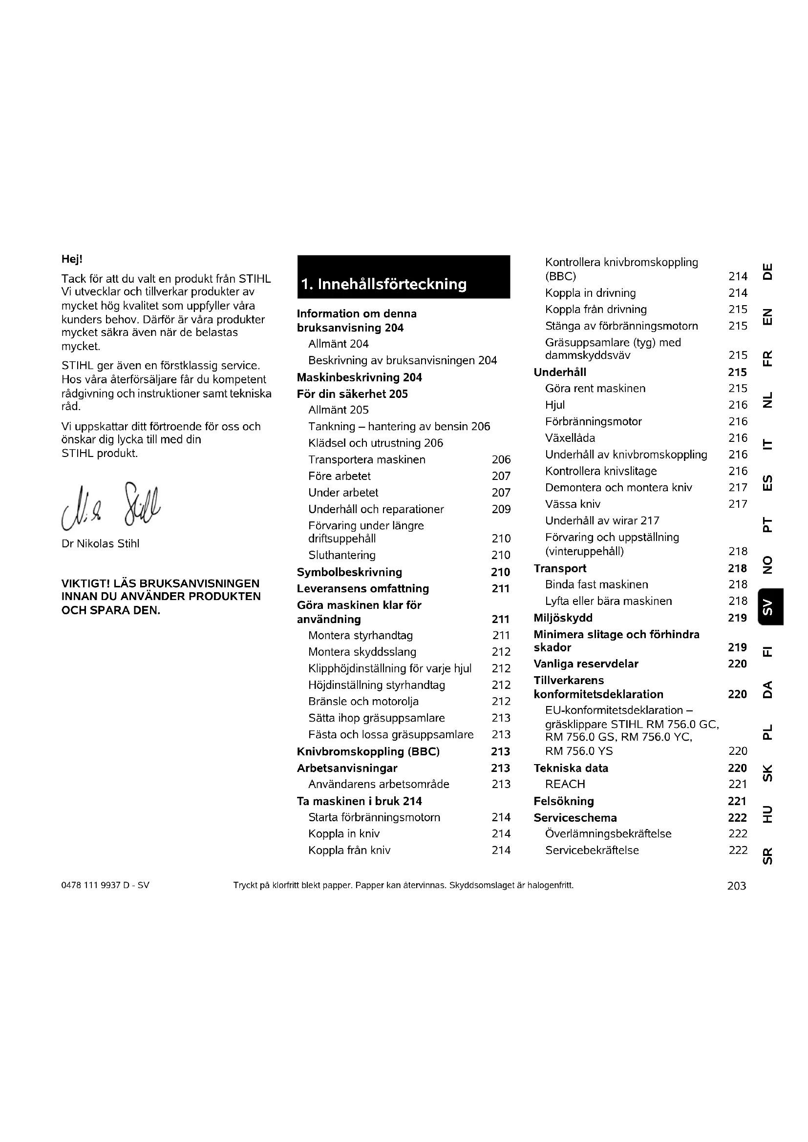 Information om denna bruksanvisning 204 Allmänt 204 Beskrivning av bruksanvisningen 204 Maskinbeskrivning 204 För din säkerhet 205 Allmänt 205 Tankning – hantering av bensin 206 Klädsel och utrustning 206 Transportera maskinen 206 Före arbetet 207 Under arbetet 207 Underhåll och reparationer 209 Förvaring under längre driftsuppehåll 210 Sluthantering 210 Symbolbeskrivning 210 Leveransens omfattning 211 Göra maskinen klar för användning 211 Montera styrhandtag 211 Montera skyddsslang 212 Klipphöjdinställning för varje hjul 212 Höjdinställning styrhandtag 212 Bränsle och motorolja 212 Sätta ihop gräsuppsamlare 213 Fästa och lossa gräsuppsamlare 213 Knivbromskoppling (BBC) 213 Arbetsanvisningar 213 Användarens arbetsområde 213 Ta maskinen i bruk 214 Starta förbränningsmotorn 214 Koppla in kniv 214 Koppla från kniv 214 Kontrollera knivbromskoppling (BBC) 214 Koppla in drivning 214 Koppla från drivning 215 Stänga av förbränningsmotorn 215 Gräsuppsamlare (tyg) med dammskyddsväv 215 Underhåll 215 Göra rent maskinen 215 Hjul 216 Förbränningsmotor 216 Växellåda 216 Underhåll av knivbromskoppling 216 Kontrollera knivslitage 216 Demontera och montera kniv 217 Vässa kniv 217 Underhåll av wirar 217 Förvaring och uppställning (vinteruppehåll) 218 Transport 218 Binda fast maskinen 218 Lyfta eller bära maskinen 218 Miljöskydd 219 Minimera slitage och förhindra skador 219 Vanliga reservdelar 220 Tillverkarens konformitetsdeklaration 220 EU-konformitetsdeklaration – gräsklippare STIHL RM 756.0 GC, RM 756.0 GS, RM 756.0 YC, RM 756.0 YS 220 Tekniska data 220 REACH 221 Felsökning 221 Serviceschema 222 Överlämningsbekräftelse 222 Servicebekräftelse 2220478 111 9937 D - SV