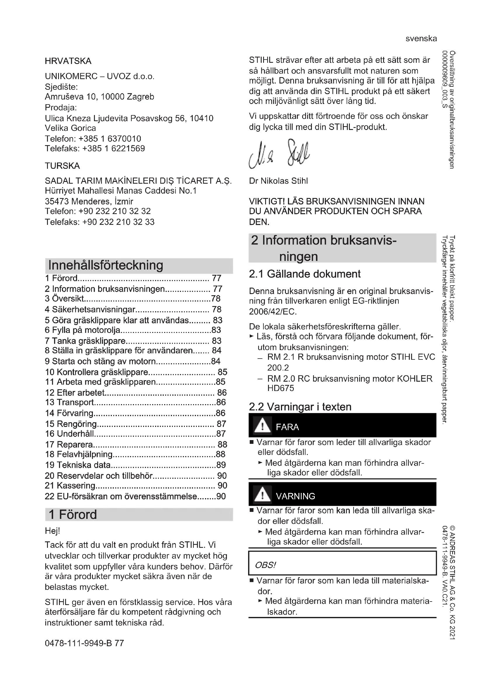 - 22 EU-försäkran om överensstämmelse 1 Förord Hej! Tack för att du valt en produkt från STIHL. Vi utvecklar och tillverkar produkter av mycket hög kvalitet som uppfyller våra kunders behov. Därför är våra produkter mycket säkra även när de belastas mycket. STIHL ger även en förstklassig service. Hos våra återförsäljare får du kompetent rådgivning och instruktioner samt tekniska råd. STIHL strävar efter att arbeta på ett sätt som är så hållbart och ansvarsfullt mot naturen som möjligt. Denna bruksanvisning är till för att hjälpa dig att använda din STIHL produkt på ett säkert och miljövänligt sätt över lång tid. Vi uppskattar ditt förtroende för oss och önskar dig lycka till med din STIHL-produkt. Dr Nikolas Stihl p. 90