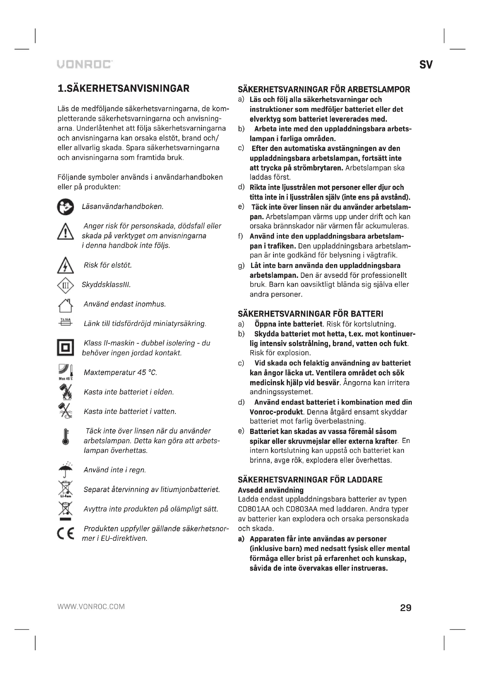 a) Öppna inte batteriet. Risk för kortslutning. b) Skydda batteriet mot hetta, t.ex. mot kontinuer- lig intensiv solstrålning, brand, vatten och fukt. Risk för explosion. c) Vid skada och felaktig användning av batteriet kan ångor läcka ut. Ventilera området och sök medicinsk hjälp vid besvär. Ångorna kan irritera andningssystemet. d) Använd endast batteriet ikombination med din Vonroc-produkt. Denna åtgärd ensamt skyddar batteriet mot farlig överbelastning.