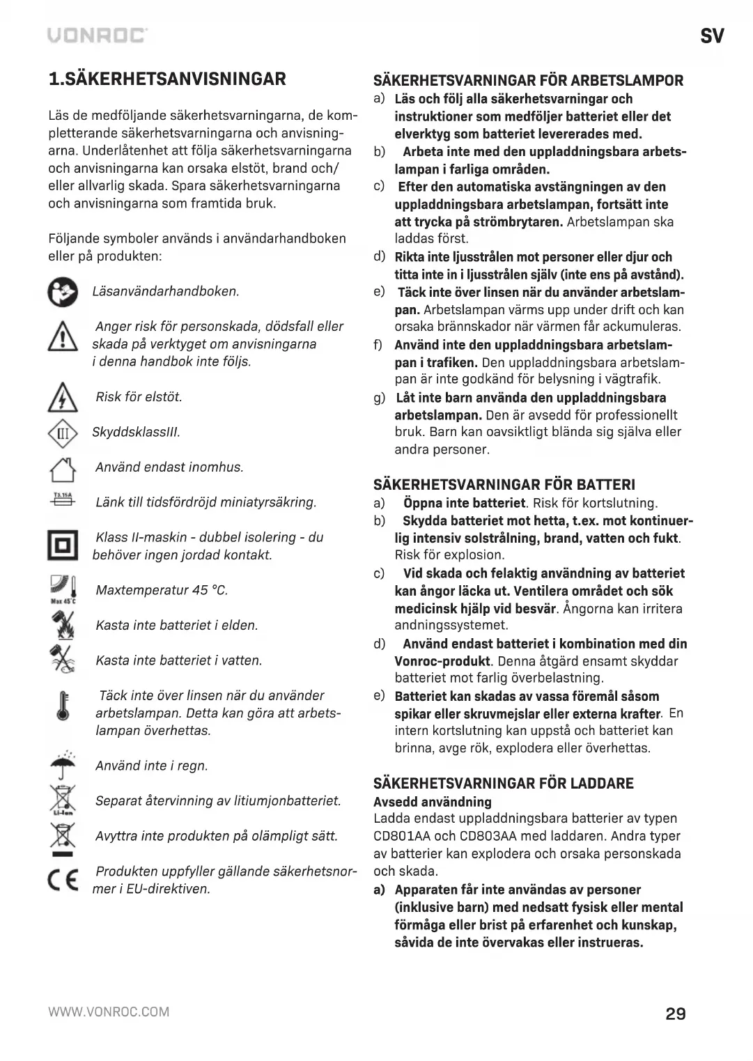 a) Öppna inte batteriet. Risk för kortslutning. b) Skydda batteriet mot hetta, t.ex. mot kontinuer- lig intensiv solstrålning, brand, vatten och fukt. Risk för explosion. c) Vid skada och felaktig användning av batteriet kan ångor läcka ut. Ventilera området och sök medicinsk hjälp vid besvär. Ångorna kan irritera andningssystemet. d) Använd endast batteriet ikombination med din Vonroc-produkt. Denna åtgärd ensamt skyddar batteriet mot farlig överbelastning.