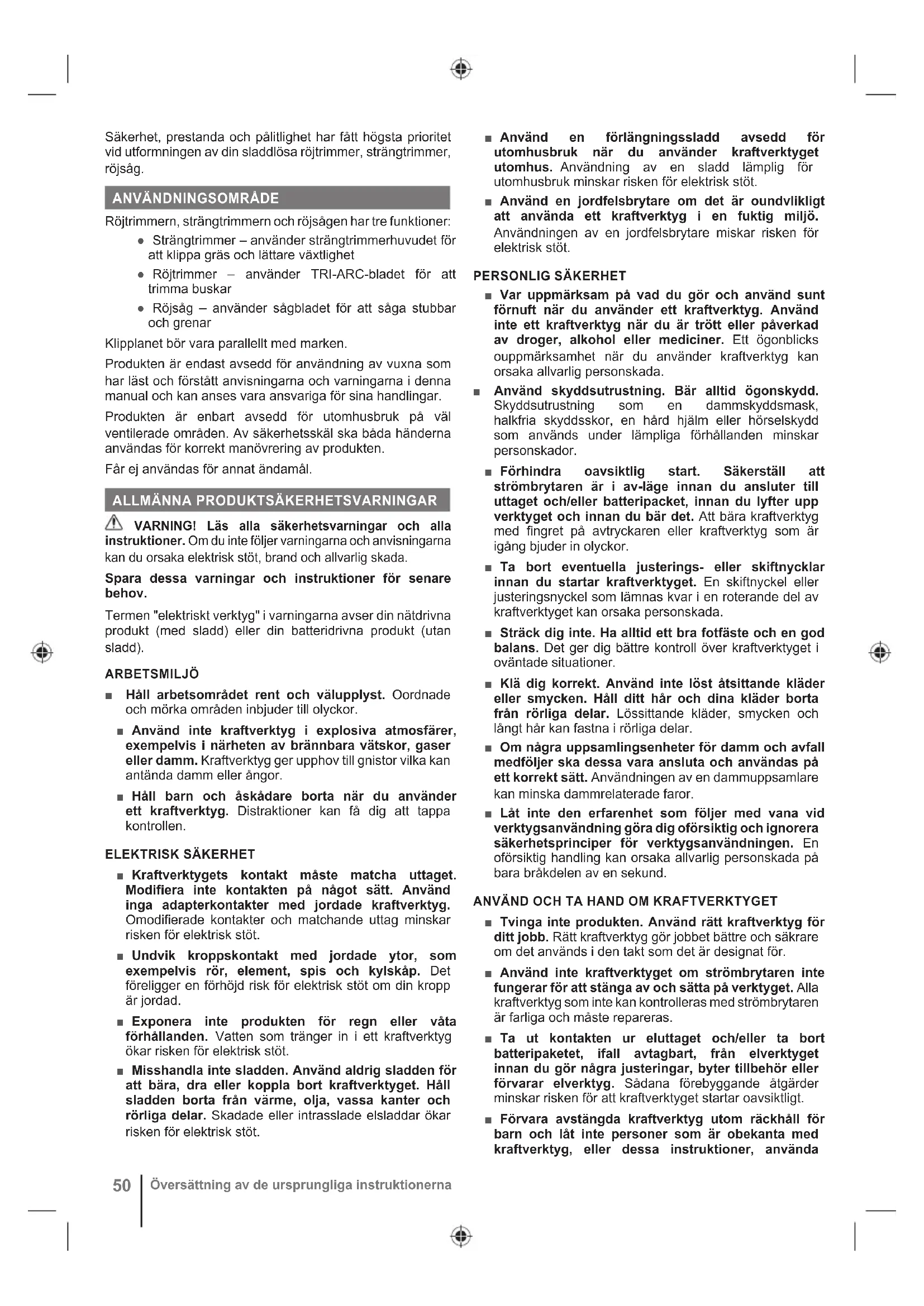 ■ Kontrollera före användning och efter påverkan att det inte finns några skadade delar. Ett defekt reglage eller någon del som är skadad eller sliten ska repareras eller ersättas av godkänt servicecenter. ■ Det lilla bladet som är fäst vid säkerhetsskyddet är avsett att trimma den nyss framförda strängen till korrekt längd för säker och optimal prestanda. Bladet är väldigt vasst. Vidrör inte bladet, särskilt vid rengöring av produkten. ■ Använd enbart ersättningstråd från tillverkaren. Använd inga andra skärtillbehör. ■ Se till att skärtillbehöret är korrekt installerat och ordentligt fäst. ■ Använd inte maskinen om inte alla skydd, avvisare och handtag är korrekt och ordentligt monterade. ■ Säkerställ att linans skärblad i säkerhetsskyddet är korrekt placerat och säkrat före varje användning. ■ Håll huvudtillbehöret under midjenivå. ■ Stäng omedelbart av produkten och plocka ur batteripaketet vid olycksfall eller fel. Använd inte produkten igen innan den har kontrollerats i sin helhet av en auktoriserad serviceverkstad. ■ För att minska risken för olycksfall i samband med rörliga delar, stäng alltid av produkten och avlägsna batteripaketet, och låt båda svalna. Se till att samtliga rörliga delar har stannat helt: ● före service ● före rensning av en blockering ● före kontroll av, rengöring av eller arbete med produkten ● före byte av tillbehör ● efter kollision med ett främmande föremål ● när produkten lämnas utan övervakning ● alltid när underhåll utförs ● när maskinen börjar vibrera onormalt ■ Se till att alla skydd, handtag och spikskydd sitter ordentligt och är i gott skick. ■ Håll produkten i de avsedda handtagen och begränsa arbetstid och exponering. ■ Se upp för föremål som kastas i väg av skäranordningen. Avlägsna skräp som små stenar, grus och andra främmande föremål från arbetsområdet innan arbete påbörjas. Vajrar eller tråd kan trasslas in i skärverktyget. ■ Produkten är utrustad med en sele. Använd selen när du använder produkten. Justera selen omsorgsfullt så att den bekvämt bär upp vikten av produkten vid din högra sida. Ta reda på snabbkopplingsmekanismen och testa den innan du börjar använda maskinen. Korrekt användning av den kan förhindra allvarliga skador i nödfall. Bär aldrig ytterligare kläder över selen eller på annat sätt begränsa åtkomsten av snabbkopplingsmekanismen. ■ Använd inte mer än ett bälte eller en sele. ■ Säkerställ alltid att ventilationshålen är öppna och fria från smuts. ■ Använd endast produkten vid temperaturer mellan 0-40 °C. ■ Förvara produkten på en plats där omgivningstemperaturen är mellan 0-40 °C. ■ Använd tåliga arbetshandskar när du monterar eller avlägsnar bladen, de har vassa kanter. ■ Försök inte att vidröra eller stoppa bladet när det roterar.SVENSKA
