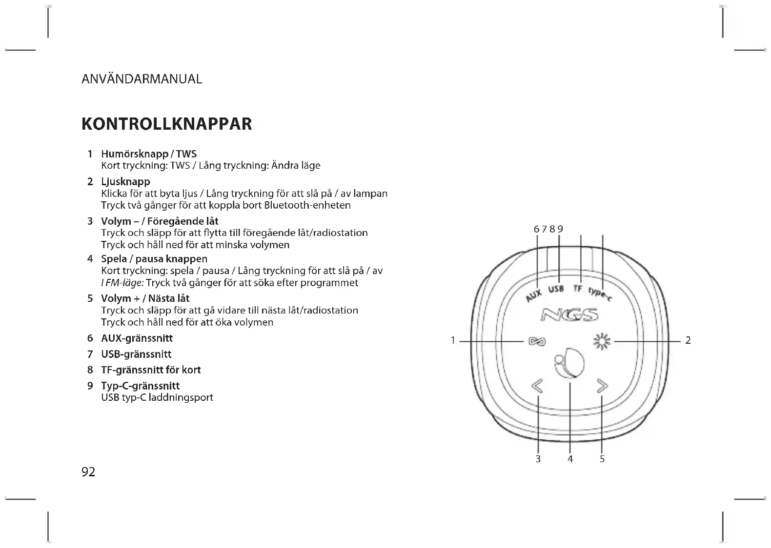 Humörsknapp / TWS Kort tryckning: TWS / Lång tryckning: Ändra läge Ljusknapp Klicka för att byta ljus / Lång tryckning för att slå på / av lampan Tryck två gånger för att koppla bort Bluetooth-enheten Volym – / Föregående låt Tryck och släpp för att ytta till föregående låt/radiostation Tryck och håll ned för att minska volymen Spela / pausa knappen Kort tryckning: spela / pausa / Lång tryckning för att slå på / av I FM-läge: Tryck två gånger för att söka efter programmet Volym + / Nästa låt Tryck och släpp för att gå vidare till nästa låt/radiostation Tryck och håll ned för att öka volymen AUX-gränssnitt USB-gränssnitt TF-gränssnitt för kort Typ-C-gränssnitt USB typ-C laddningsport