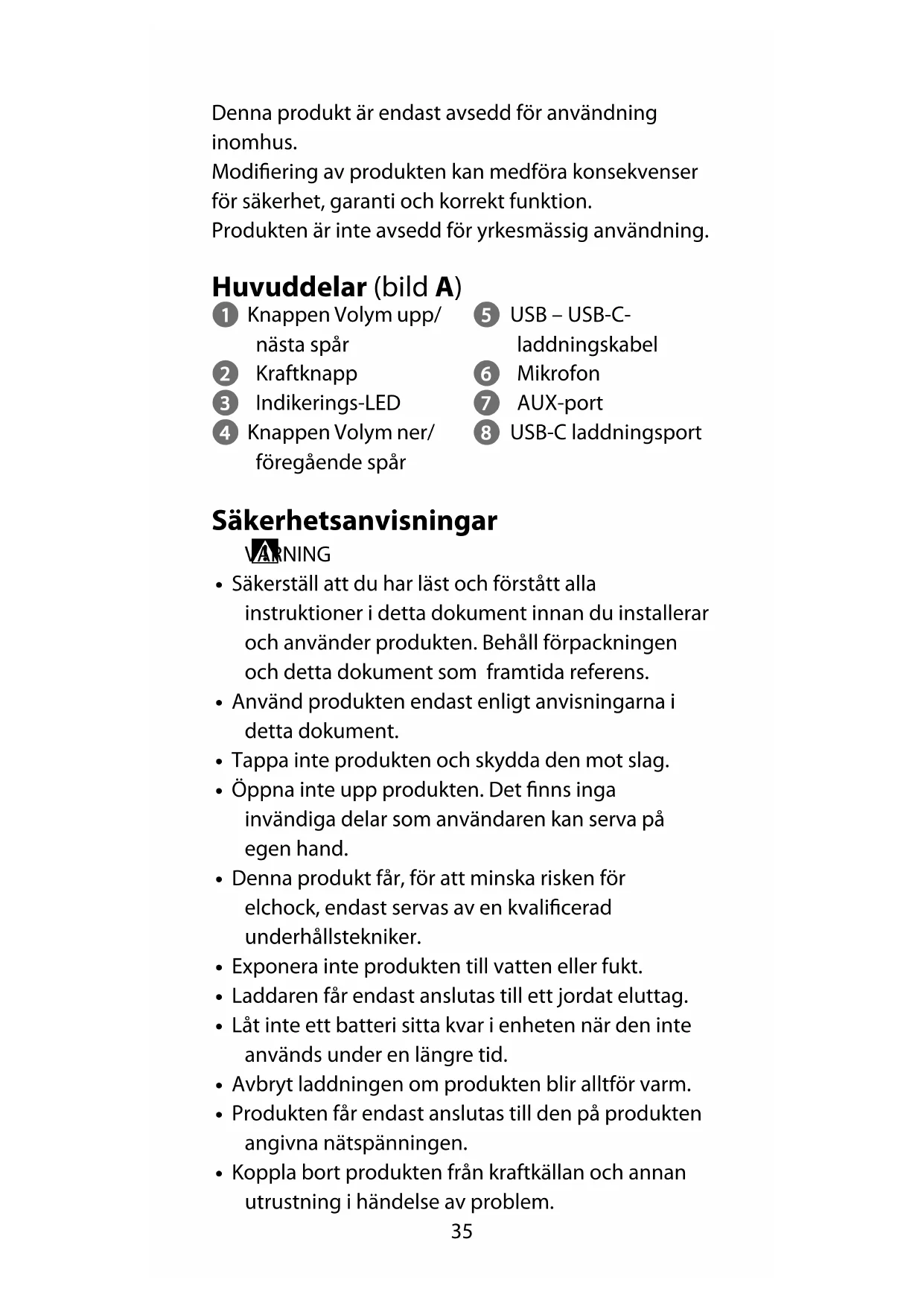 Snabbstartsguide Bluetooth®-högtalare SPBT2006BK För ytterligare information, se den utökade manualen online: ned.is/spbt2006bk Avsedd användning Denna produkt är avsedd att spela upp ljud Bluetooth® eller ljudkabel.35 Denna produkt är endast avsedd för användning inomhus. Modiering av produkten kan medföra konsekvenser för säkerhet, garanti och korrekt funktion. Produkten är inte avsedd för yrkesmässig användning. Huvuddelar (bild A) 1 Knappen Volym upp/ nästa spår 2 Kraftknapp 3 Indikerings-LED 4 Knappen Volym ner/ föregående spår 5 USB – USB-C- laddningskabel 6 Mikrofon 7 AUX-port 8 USB-C laddningsport Säkerhetsanvisningar