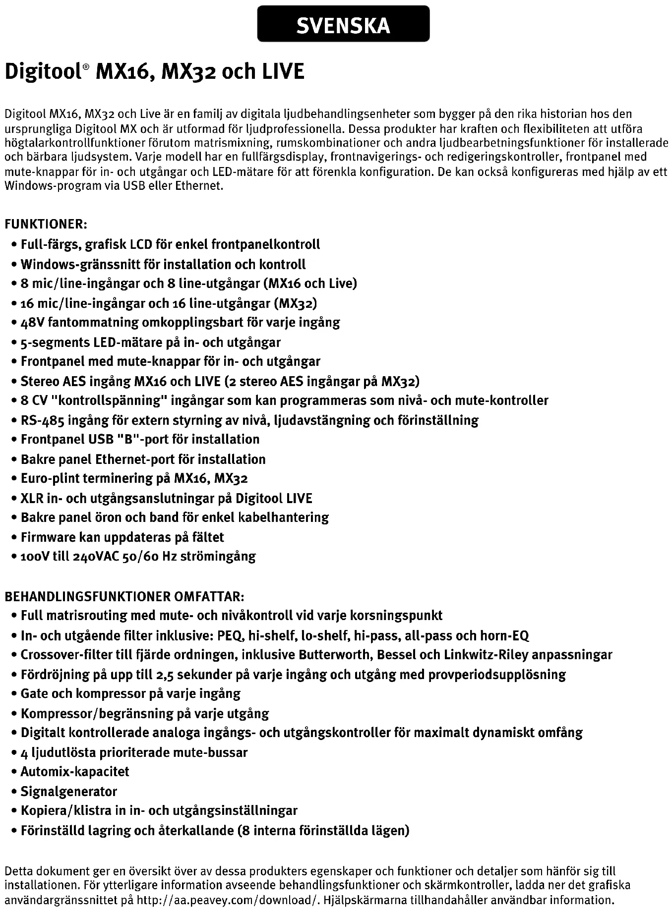 - Förinställdlagringochåterkallande(8internaförinställdalägen) Detta dokument ger en översikt över av dessa produkters egenskaper och funktioner och detaljer som hänför sig till installationen. För ytterligare information avseende behandlingsfunktioner och skärmkontroller, ladda ner det grafiska användargränssnittet på http://aa.peavey.com/download/. Hjälpskärmarna tillhandahåller användbar information.Digitool