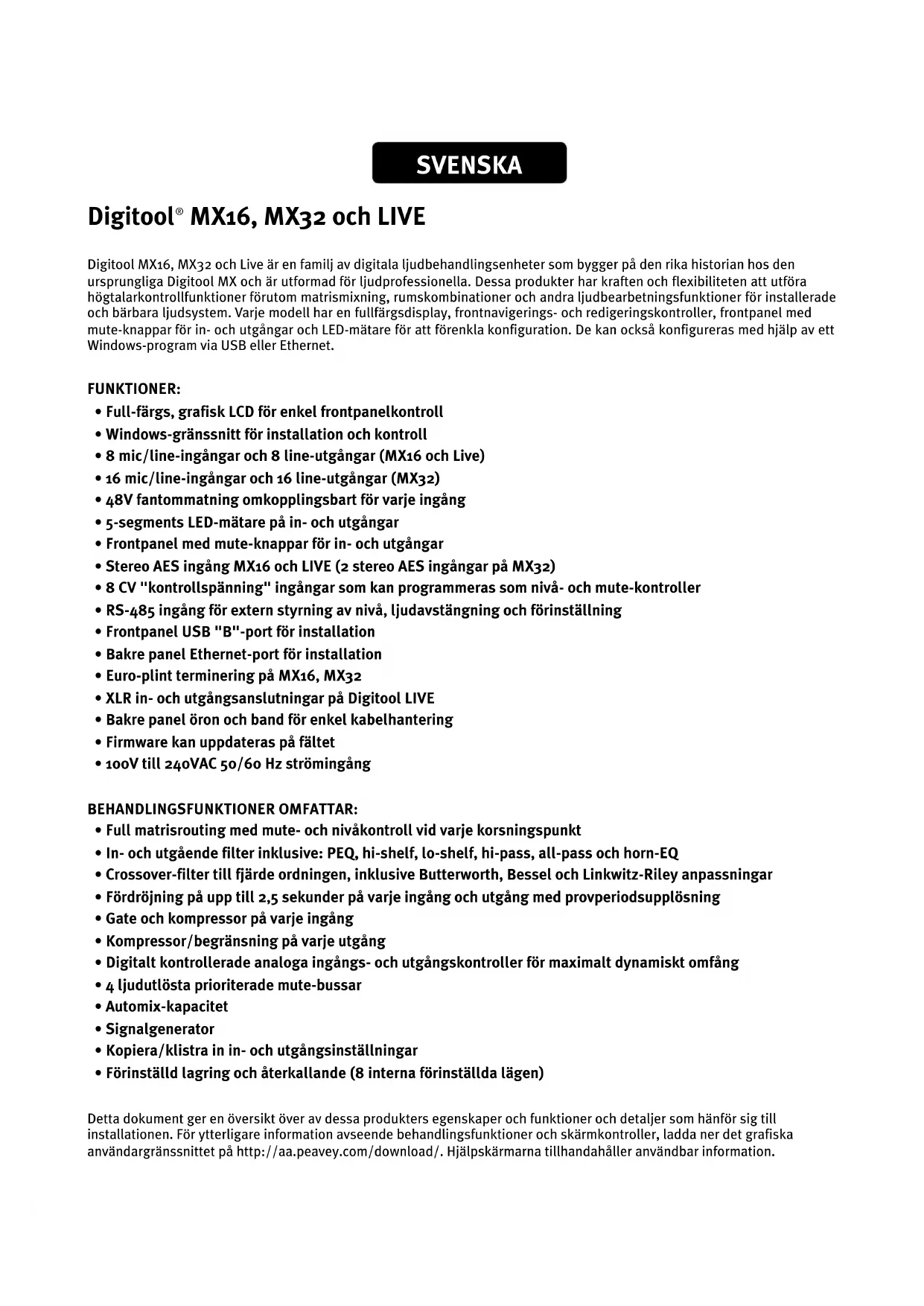 - Förinställdlagringochåterkallande(8internaförinställdalägen) Detta dokument ger en översikt över av dessa produkters egenskaper och funktioner och detaljer som hänför sig till installationen. För ytterligare information avseende behandlingsfunktioner och skärmkontroller, ladda ner det grafiska användargränssnittet på http://aa.peavey.com/download/. Hjälpskärmarna tillhandahåller användbar information.Digitool
