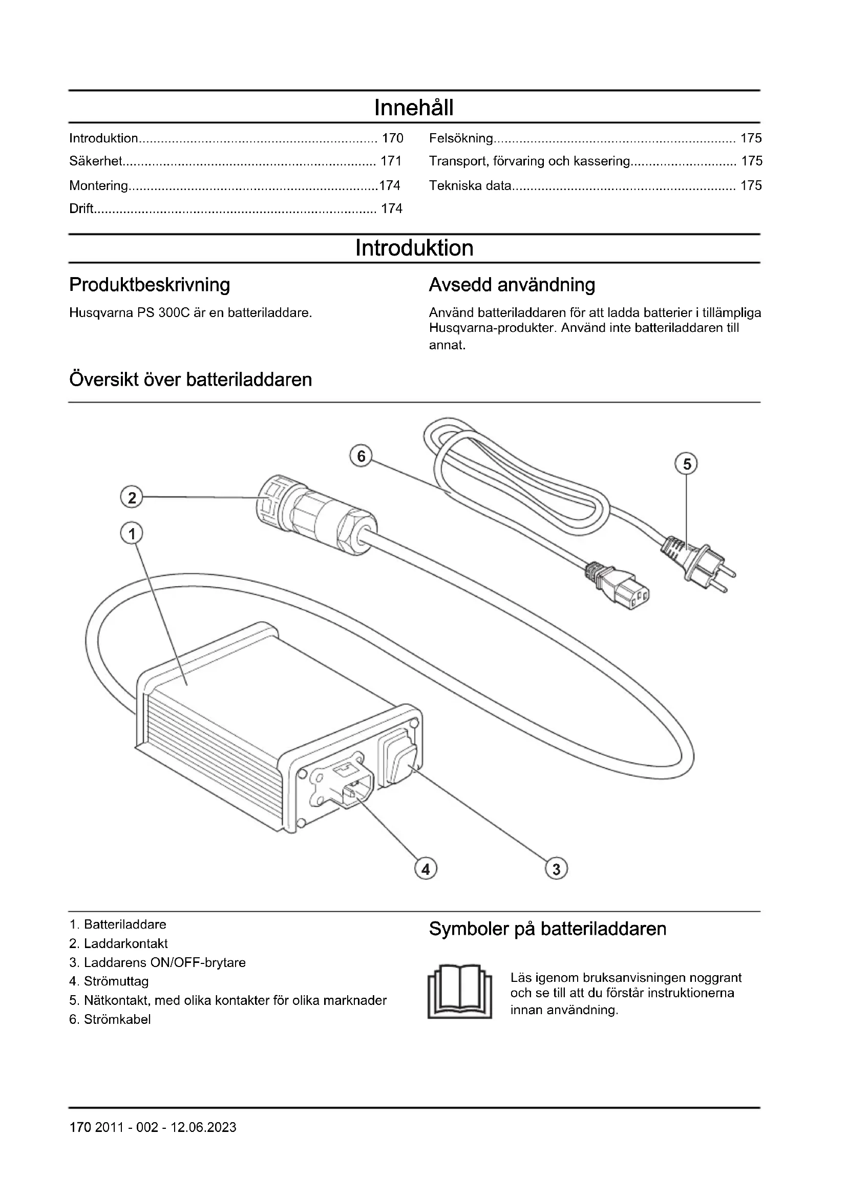 Symboler på batteriladdaren Läs igenom bruksanvisningen noggrant och se till att du förstår instruktionerna innan användning. 170 2011 - 002 - 12.06.2023Batteriladdaren överensstämmer med gällande EG-direktiv. Batteriladdaren överensstämmer med gällande brittiska direktiv. IP54 – Batteriladdaren har skydd mot damm och vattenstänk. Batteriladdaren eller förpackningen till batteriladdaren är inte hushållsavfall. Återvinn den på en plats för kassering av elektrisk och elektronisk utrustning. Kod som kan skannas. Notera: Övriga symboler/dekaler på batteriladdaren avser specifika krav för certifieringar på vissa kommersiella marknader. Säkerhet Säkerhetsdefinitioner Varningar, försiktighetsåtgärder och anmärkningar används för att betona speciellt viktiga delar i bruksanvisningen. VARNING: Används om det finns risk för skador eller dödsfall för användaren eller kringstående om anvisningarna i bruksanvisningen inte följs. OBSERVERA: Används om det finns risk för skada på produkten, annat material eller det angränsande området om anvisningarna i bruksanvisningen inte följs. Notera: Används för att ge mer information som är nödvändig i en viss situation. Viktiga säkerhetsinstruktioner VARNING: Läs alla säkerhetsvarningar och alla anvisningar. Om du inte följer varningarna och instruktionerna kan det leda till elektriska stötar, brand eller allvarlig skada. Notera: Spara alla varningar och instruktioner.