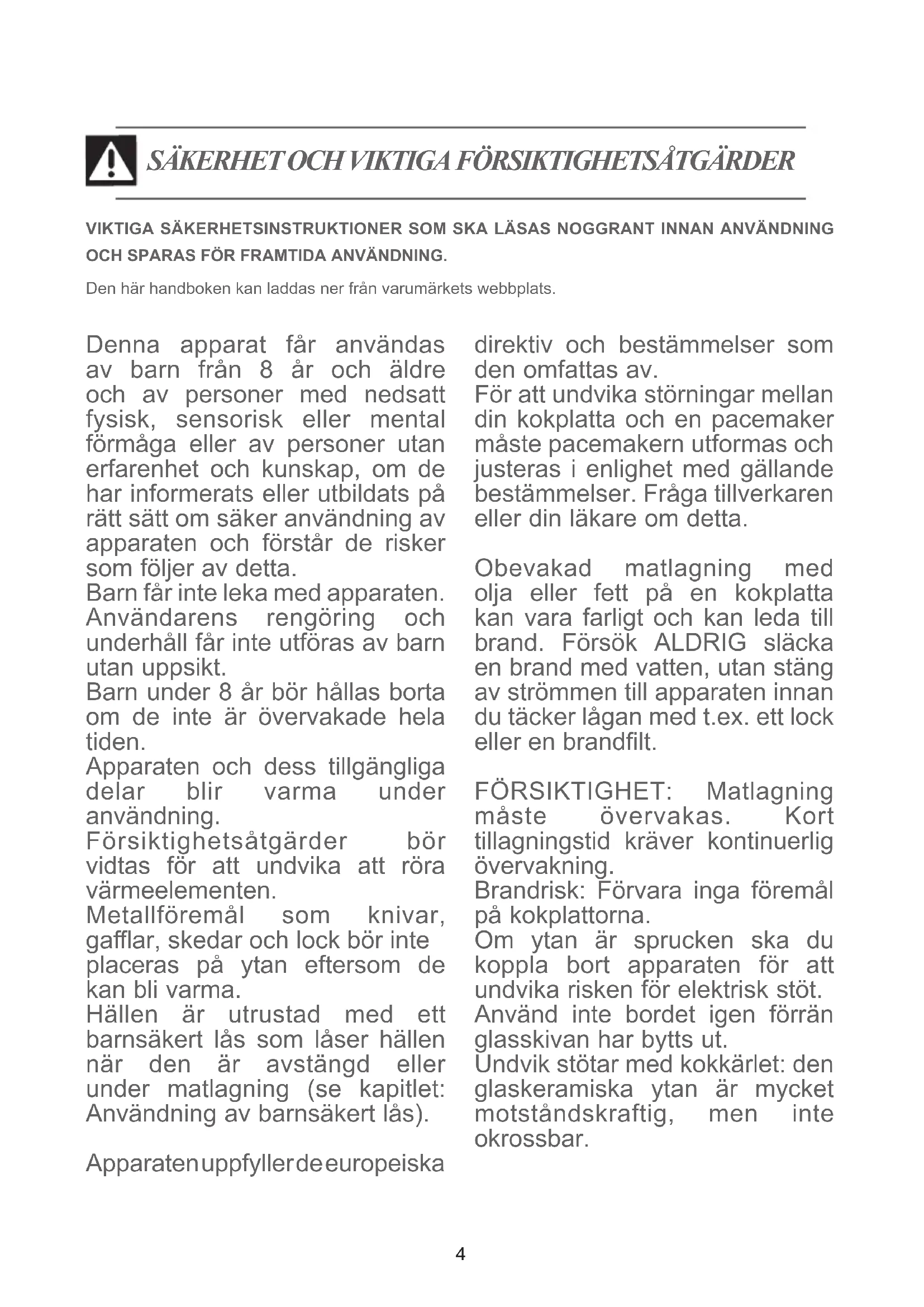 4 Underhåll ...............................................................................................19 5 Felsökning .............................................................................................20 6 Kundtjänst ..............................................................................................214 SÄKERHET OCH VIKTIGA FÖRSIKTIGHETSÅTGÄRDER Denna apparat får användas av barn från 8 år och äldre och av personer med nedsatt fysisk, sensorisk eller mental förmåga eller av personer utan erfarenhet och kunskap, om de har informerats eller utbildats på rätt sätt om säker användning av apparaten och förstår de risker som följer av detta. Barn får inte leka med apparaten. Användarens rengöring och underhåll får inte utföras av barn utan uppsikt. Barn under 8 år bör hållas borta om de inte är övervakade hela tiden. Apparaten och dess tillgängliga delar blir varma under användning. Försiktighetsåtgärder bör vidtas för att undvika att röra värmeelementen. Metallföremål som knivar, gaar, skedar och lock bör inte placeras på ytan eftersom de kan bli varma. Hällen är utrustad med ett barnsäkert lås som låser hällen när den är avstängd eller under matlagning (se kapitlet: Användning av barnsäkert lås). Apparaten uppfyller de europeiska direktiv och bestämmelser som den omfattas av. För att undvika störningar mellan din kokplatta och en pacemaker måste pacemakern utformas och justeras i enlighet med gällande bestämmelser. Fråga tillverkaren eller din läkare om detta. Obevakad matlagning med olja eller fett på en kokplatta kan vara farligt och kan leda till brand. Försök ALDRIG släcka en brand med vatten, utan stäng av strömmen till apparaten innan du täcker lågan med t.ex. ett lock eller en brandlt. FÖRSIKTIGHET: Matlagning måste övervakas. Kort tillagningstid kräver kontinuerlig övervakning. Brandrisk: Förvara inga föremål på kokplattorna. Om ytan är sprucken ska du koppla bort apparaten för att undvika risken för elektrisk stöt. Använd inte bordet igen förrän glasskivan har bytts ut. Undvik stötar med kokkärlet: den glaskeramiska ytan är mycket motståndskraftig, men inte okrossbar. VIKTIGA SÄKERHETSINSTRUKTIONER SOM SKA LÄSAS NOGGRANT INNAN ANVÄNDNING OCH SPARAS FÖR FRAMTIDA ANVÄNDNING. Den här handboken kan laddas ner från varumärkets webbplats.5 SÄKERHET OCH VIKTIGA FÖRSIKTIGHETSÅTGÄRDER Placera inte ett hett lock platt på kokplattan. En "sugkoppseekt" kan skada den glaskeramiska toppen. Undvik att gnugga kokkärlet, eftersom det kan skada den glaskeramiska plattan i längden. Använd aldrig aluminiumfolie för matlagning. Placera aldrig produkter som är förpackade i aluminium eller i aluminiumlådor på kokplattan. Aluminiumet smälter och skadar kokplattan permanent. Förvara inte rengöringsmedel eller brännbara produkter i skåpet under kokplattan. Spishällarna måste anslutas till strömförsörjningen via en omnipolär rånkopplingsanordning i enlighet med gällande installationsföreskrifter. En avbrytningsanordning ska nnas i det fasta röret. Din kokplatta är konstruerad för att fungera vid 50 Hz eller 60 Hz (50 Hz/60 Hz) utan några särskilda åtgärder från din sida. Efter användning ska du stänga av spishällen med hjälp av dess kontrollanordning och inte förlita dig på grytans sensor. Om strömförsörjningskabeln är skadad måste den bytas ut av tillverkaren, dess kundtjänst eller liknande kvalicerade personer för att undvika fara. Se till att strömkabeln till en elektrisk apparat som är ansluten i närheten av hällen inte kommer i kontakt med kokzonerna. Använd aldrig en ångrengörare för att rengöra hällen. Apparaten är inte avsedd att användas med en extern timer eller ett separat fjärrkontrollsystem. FÖRSIKTIGHET: Använd endast skydd för kokplattan som är utformade av kokplattans tillverkare, som anges i bruksanvisningen som lämplig eller som är inbyggda i apparaten. Användning av olämpliga skydd kan orsaka olyckor.6 MILJÖ