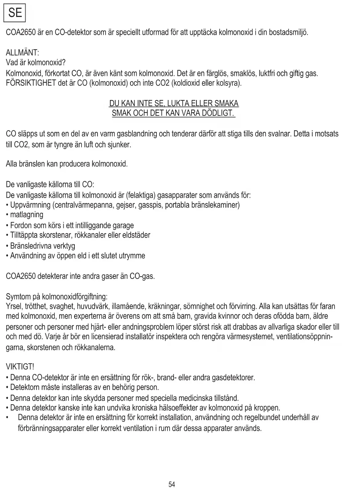 - Användning av öppen eld i ett slutet utrymme COA2650 detekterar inte andra gaser än CO-gas. Symtom på kolmonoxidförgiftning: Yrsel, trötthet, svaghet, huvudvärk, illamående, kräkningar, sömnighet och förvirring. Alla kan utsättas för faran med kolmonoxid, men experterna är överens om att små barn, gravida kvinnor och deras ofödda barn, äldre personer och personer med hjärt- eller andningsproblem löper störst risk att drabbas av allvarliga skador eller till och med dö. Varje år bör en licensierad installatör inspektera och rengöra värmesystemet, ventilationsöppnin- garna, skorstenen och rökkanalerna. VIKTIGT!