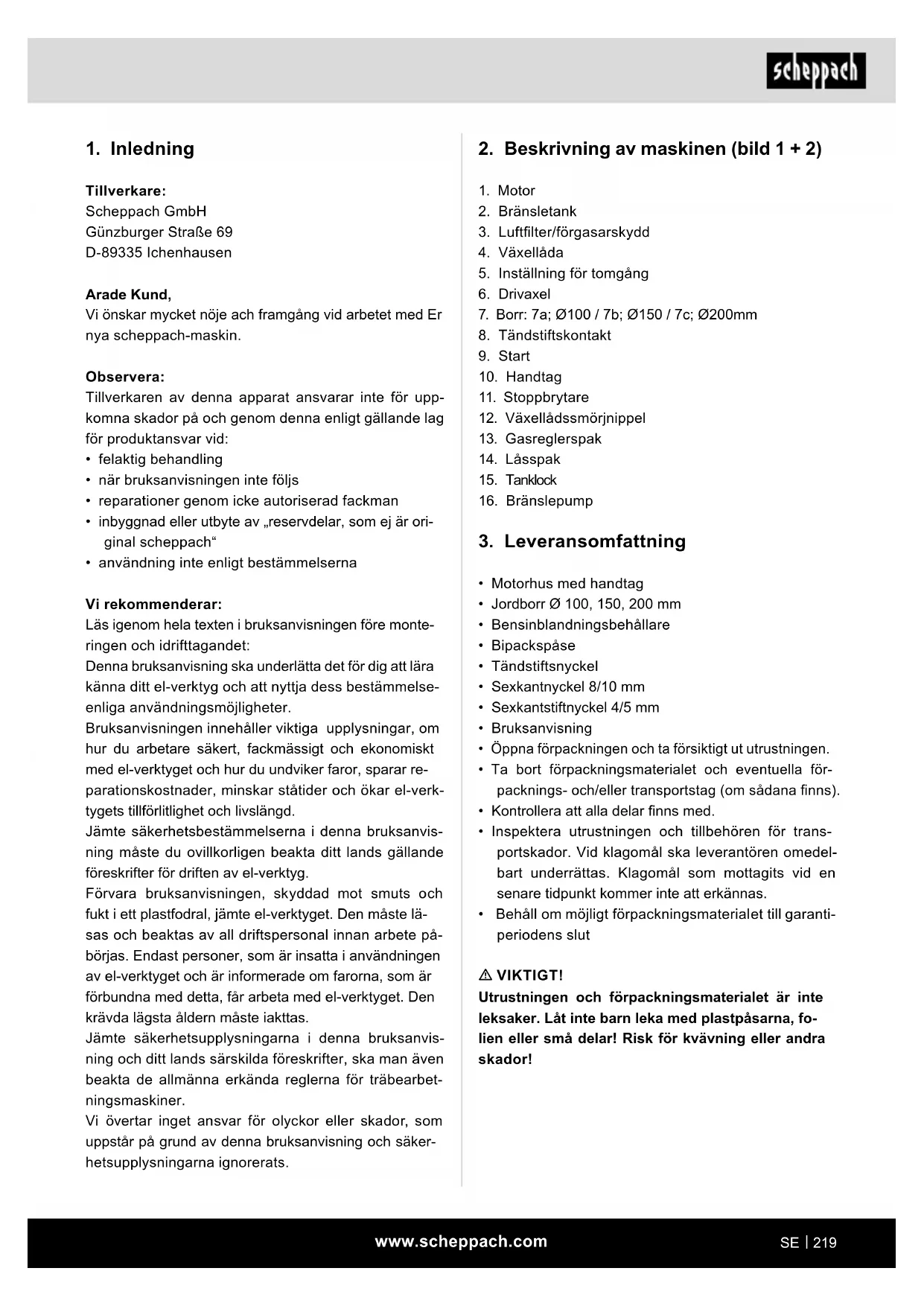 m OBSERVERA! Montera klart apparaten före idrifttagning! Före idrifttagning är det viktigt att du läser och följer säkerhetsinformationen. Stäng alltid av motorn vid allt arbete på jordborren, dra ut tändstift och bär skyddshandskar. Jordborren får inte startas förrän efter komplett ihopmontering och kontroll. OBSERVERA! Läs säkerhetsinformationen noggrant (se ”Säkerhetsinformation” och övrig information om bensindrivna maskiner).www.scheppach.com