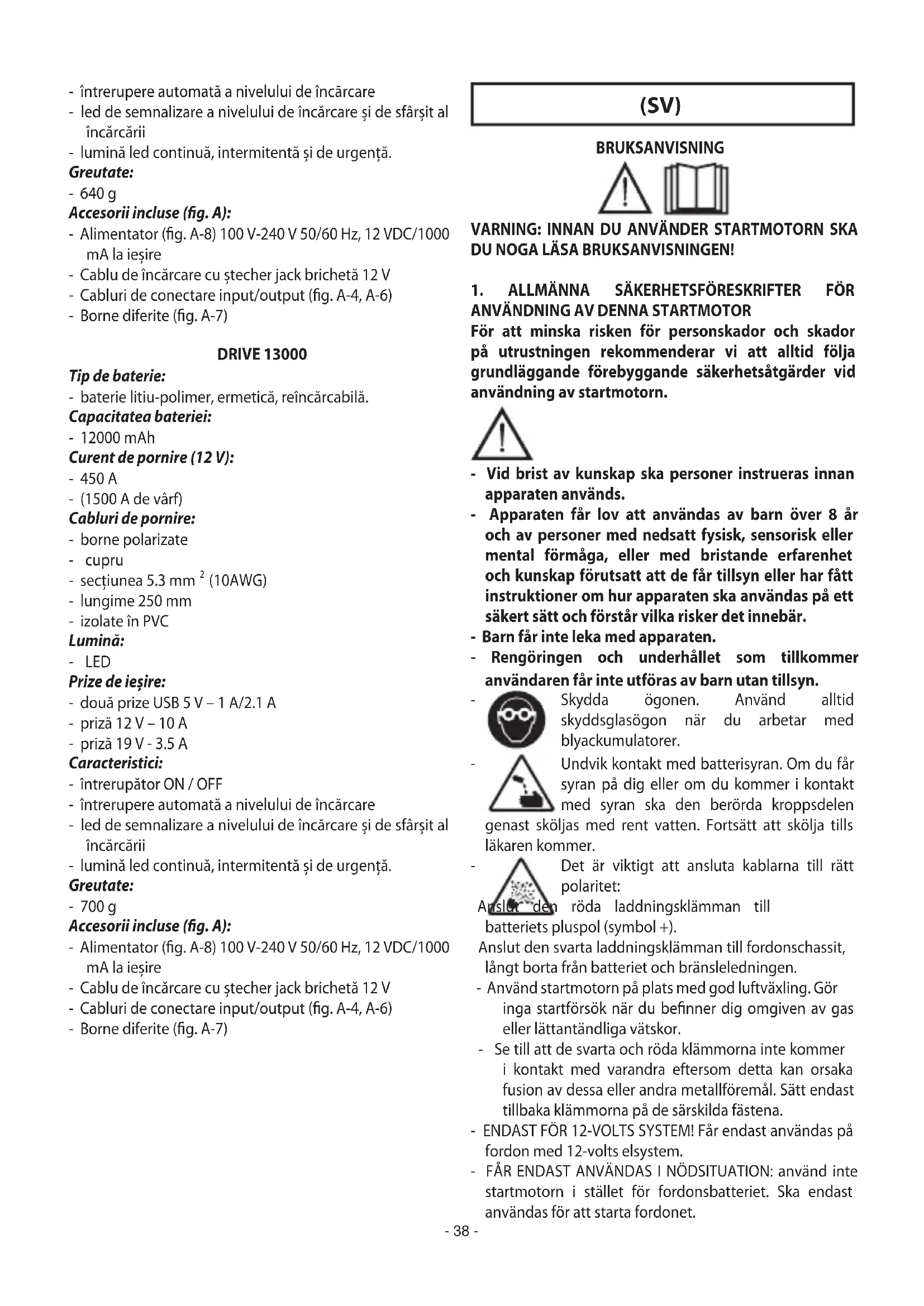(10AWG) - längd 250 mm - PVC-isolatorer Ljus: - LED Utgångsuttag: - två uttag USB 5V - 1A/2.1A - uttag 12 V – 10 A - uttag 19 V – 3.5 A Egenskaper: - brytare ON/OFF - automatiskt avbrott för laddningsnivå - signaleringsled för laddningsnivå och laddningsslut - kontinuerligt LED-ljus, intermittent och nödljus. Vikt: - 640 g Tillbehör som ingår (g. A): - Nätaggregat (g. A-8) 100 V-240 V 50/60 Hz, 12 VDC/1000 mA i utgång - Laddningskabel med cigarettändarjack 12 V - Anslutningskablar input/output (g. A-4, A-6) - Olika terminaler (g. A-7) DRIVE 13000 Typ av batterier: - litium-polymerbatteri, hermetiskt, uppladdningsbart. Batteriets kapacitet: - 12000 mAh Startström (12 V): - 450 A - (1500 A toppspänning) Startkablar: - polariserade terminaler - koppar - genomskärning 5.3 mm