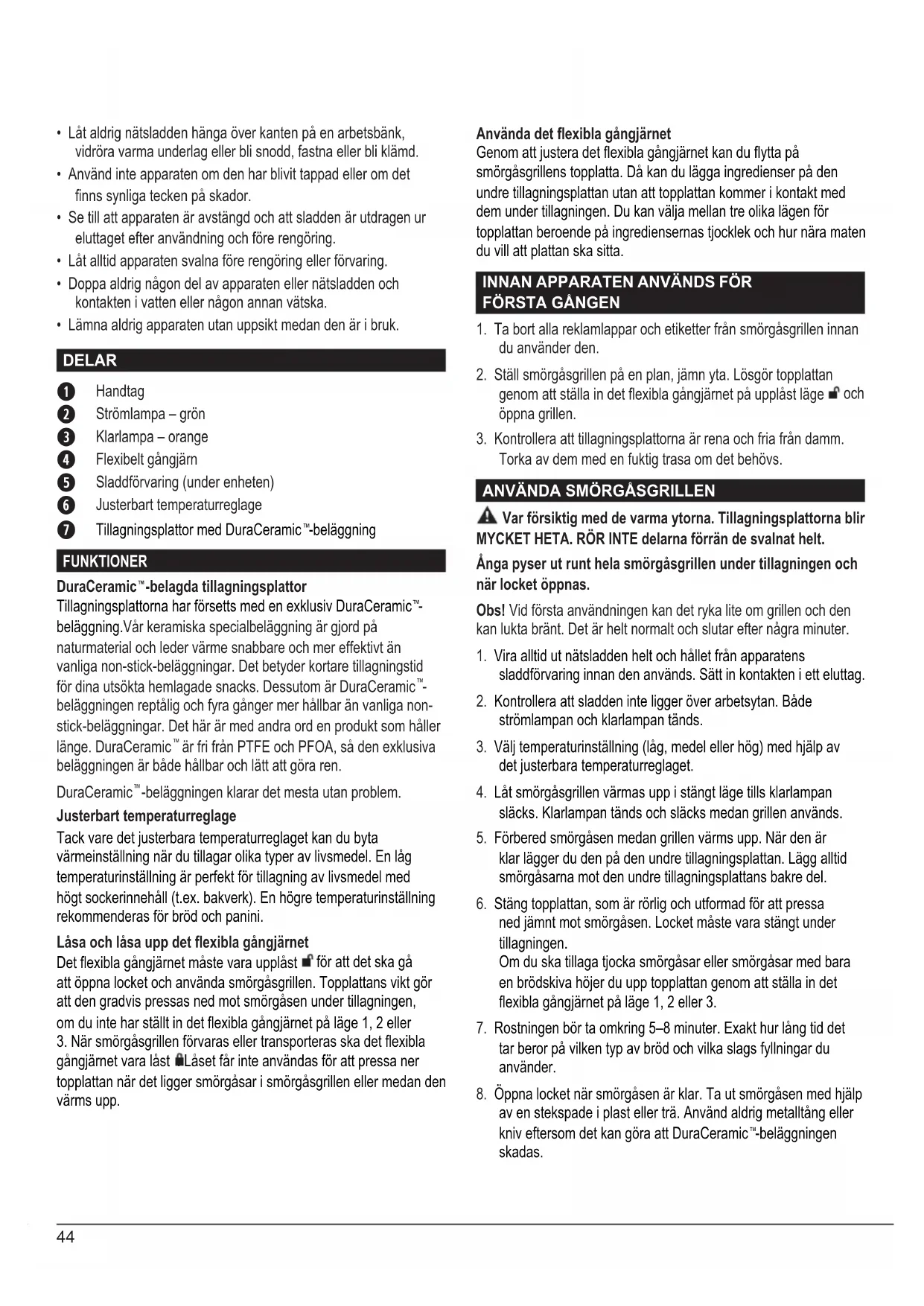 Var försiktig med de varma ytorna. Tillagningsplattorna blir MYCKET HETA. RÖR INTE delarna förrän de svalnat helt. Ånga pyser ut runt hela smörgåsgrillen under tillagningen och när locket öppnas. Obs! Vid första användningen kan det ryka lite om grillen och den kan lukta bränt. Det är helt normalt och slutar efter några minuter.