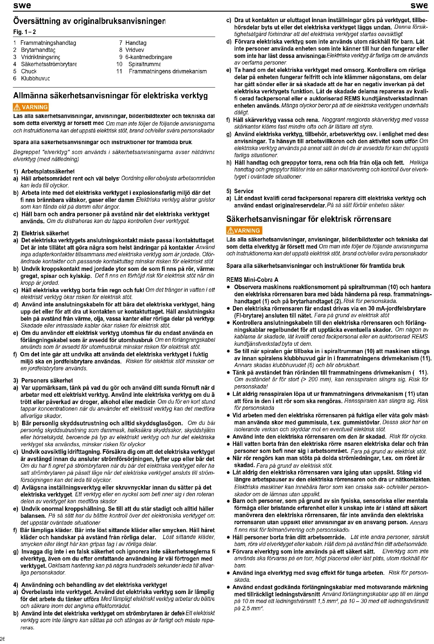 Läs alla säkerhetsanvisningar, anvisningar, bilder/bildtexter och tekniska data som detta elverktyg är försett med. Om man inte följer de följande anvisningarna och instruktionerna kan det uppstå elektrisk stöt, brand och/eller svåra personskador. Spara alla säkerhetsanvisningar och instruktioner för framtida bruk. REMS Mini-Cobra
