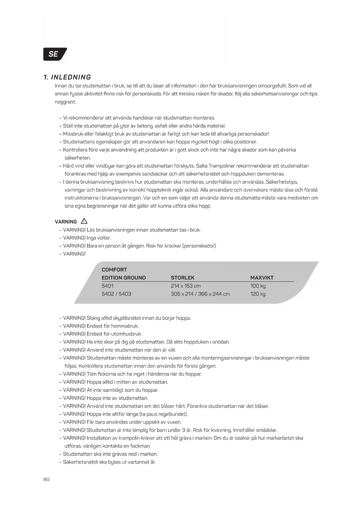 Innan du tar studsmattan i bruk, se till att du läser all information i den här bruksanvisningen omsorgsfullt. Som vid all annan fysisk aktivitet finns risk för personskada. För att minska risken för skador, följ alla säkerhetsanvisningar och tips noggrant. – Vi rekommenderar att använda handskar när studsmattan monteras. – Ställ inte studsmattan på ytor av betong, asfalt eller andra hårda material. – Missbruk eller felaktigt bruk av studsmattan är farligt och kan leda till allvarliga personskador! – Studsmattans egenskaper gör att användaren kan hoppa mycket högt i olika positioner. – Kontrollera före varje användning att produkten är i gott skick och inte har några skador som kan påverka säkerheten. – Hård vind eller vindbyar kan göra att studsmattan förskjuts. Salta Trampoliner rekommenderar att studsmattan förankras med hjälp av exempelvis sandsäckar och att säkerhetsnätet och hoppduken demonteras. – I denna bruksanvisning beskrivs hur studsmattan ska monteras, underhållas och användas. Säkerhetstips, varningar och beskrivning av korrekt hoppteknik ingår också. Alla användare och övervakare måste läsa och förstå instruktionerna i bruksanvisningen. Var och en som väljer att använda denna studsmatta måste vara medveten om sina egna begränsningar när det gäller att kunna utföra olika hopp. VARNING – VARNING! Läs bruksanvisningen innan studsmattan tas i bruk. – VARNING! Inga volter. – VARNING! Bara en person åt gången. Risk för krockar (personskador). – VARNING!