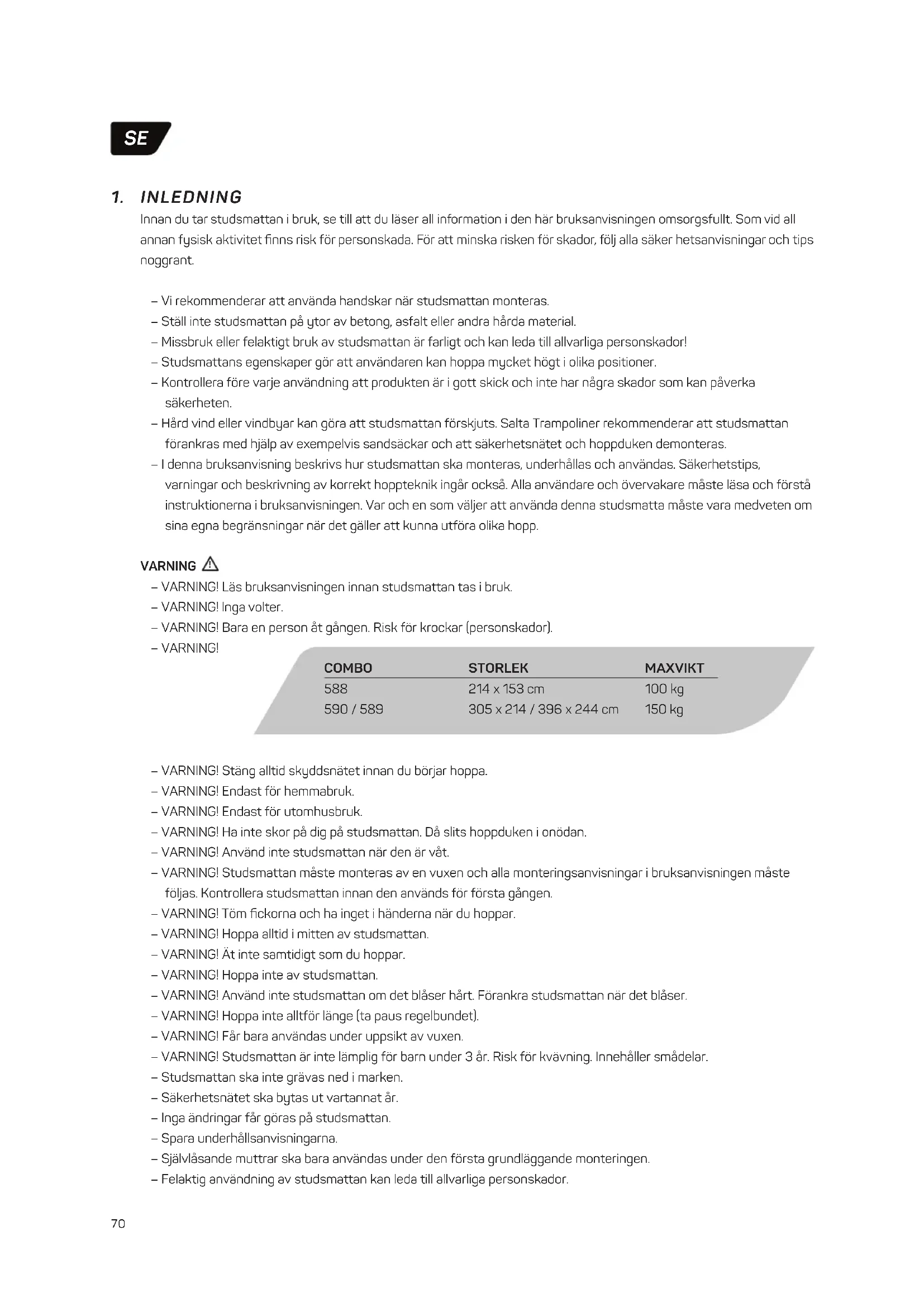 Innan du tar studsmattan i bruk, se till att du läser all information i den här bruksanvisningen omsorgsfullt. Som vid all annan fysisk aktivitet finns risk för personskada. För att minska risken för skador, följ alla säker hetsanvisningar och tips noggrant. – Vi rekommenderar att använda handskar när studsmattan monteras. – Ställ inte studsmattan på ytor av betong, asfalt eller andra hårda material. – Missbruk eller felaktigt bruk av studsmattan är farligt och kan leda till allvarliga personskador! – Studsmattans egenskaper gör att användaren kan hoppa mycket högt i olika positioner. – Kontrollera före varje användning att produkten är i gott skick och inte har några skador som kan påverka säkerheten. – Hård vind eller vindbyar kan göra att studsmattan förskjuts. Salta Trampoliner rekommenderar att studsmattan förankras med hjälp av exempelvis sandsäckar och att säkerhetsnätet och hoppduken demonteras. – I denna bruksanvisning beskrivs hur studsmattan ska monteras, underhållas och användas. Säkerhetstips, varningar och beskrivning av korrekt hoppteknik ingår också. Alla användare och övervakare måste läsa och förstå instruktionerna i bruksanvisningen. Var och en som väljer att använda denna studsmatta måste vara medveten om sina egna begränsningar när det gäller att kunna utföra olika hopp. VARNING – VARNING! Läs bruksanvisningen innan studsmattan tas i bruk. – VARNING! Inga volter. – VARNING! Bara en person åt gången. Risk för krockar (personskador). – VARNING! – VARNING! Stäng alltid skyddsnätet innan du börjar hoppa. – VARNING! Endast för hemmabruk. – VARNING! Endast för utomhusbruk. – VARNING! Ha inte skor på dig på studsmattan. Då slits hoppduken i onödan. – VARNING! Använd inte studsmattan när den är våt. – VARNING! Studsmattan måste monteras av en vuxen och alla monteringsanvisningar i bruksanvisningen måste följas. Kontrollera studsmattan innan den används för första gången. – VARNING! Töm fickorna och ha inget i händerna när du hoppar. – VARNING! Hoppa alltid i mitten av studsmattan. – VARNING! Ät inte samtidigt som du hoppar. – VARNING! Hoppa inte av studsmattan. – VARNING! Använd inte studsmattan om det blåser hårt. Förankra studsmattan när det blåser. – VARNING! Hoppa inte alltför länge (ta paus regelbundet). – VARNING! Får bara användas under uppsikt av vuxen. – VARNING! Studsmattan är inte lämplig för barn under 3 år. Risk för kvävning. Innehåller smådelar. – Studsmattan ska inte grävas ned i marken. – Säkerhetsnätet ska bytas ut vartannat år. – Inga ändringar får göras på studsmattan. – Spara underhållsanvisningarna. – Självlåsande muttrar ska bara användas under den första grundläggande monteringen. – Felaktig användning av studsmattan kan leda till allvarliga personskador. COMBO