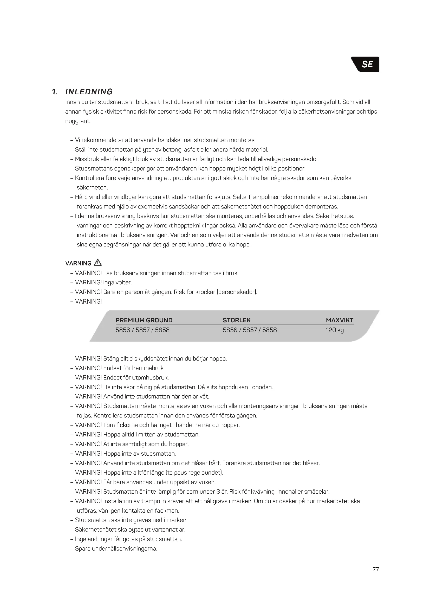 Innan du tar studsmattan i bruk, se till att du läser all information i den här bruksanvisningen omsorgsfullt. Som vid all annan fysisk aktivitet finns risk för personskada. För att minska risken för skador, följ alla säkerhetsanvisningar och tips noggrant. – Vi rekommenderar att använda handskar när studsmattan monteras. – Ställ inte studsmattan på ytor av betong, asfalt eller andra hårda material. – Missbruk eller felaktigt bruk av studsmattan är farligt och kan leda till allvarliga personskador! – Studsmattans egenskaper gör att användaren kan hoppa mycket högt i olika positioner. – Kontrollera före varje användning att produkten är i gott skick och inte har några skador som kan påverka säkerheten. – Hård vind eller vindbyar kan göra att studsmattan förskjuts. Salta Trampoliner rekommenderar att studsmattan förankras med hjälp av exempelvis sandsäckar och att säkerhetsnätet och hoppduken demonteras. – I denna bruksanvisning beskrivs hur studsmattan ska monteras, underhållas och användas. Säkerhetstips, varningar och beskrivning av korrekt hoppteknik ingår också. Alla användare och övervakare måste läsa och förstå instruktionerna i bruksanvisningen. Var och en som väljer att använda denna studsmatta måste vara medveten om sina egna begränsningar när det gäller att kunna utföra olika hopp. VARNING – VARNING! Läs bruksanvisningen innan studsmattan tas i bruk. – VARNING! Inga volter. – VARNING! Bara en person åt gången. Risk för krockar (personskador). – VARNING!