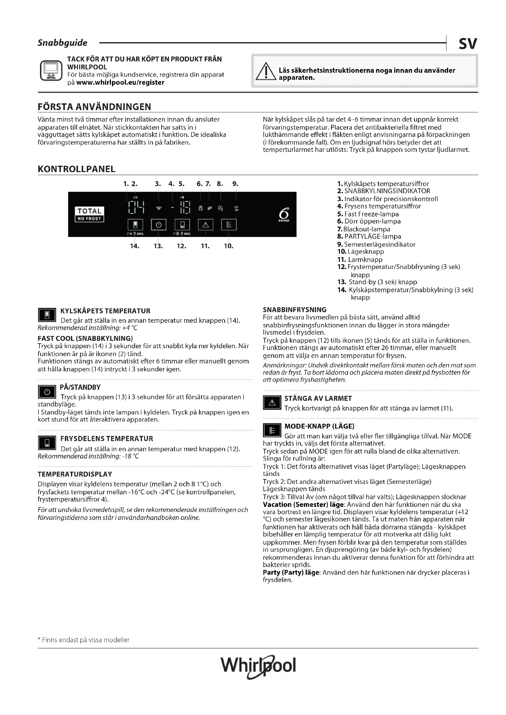 - Kun tilgjengelig på noen modellerSV Snabbguide TACK FÖR ATT DU HAR KÖPT EN PRODUKT FRÅN WHIRLPOOL För bästa möjliga kundservice, registrera din apparat på www . whirlpool . eu/ register Läs säkerhetsinstruktionerna noga innan du använder apparaten.