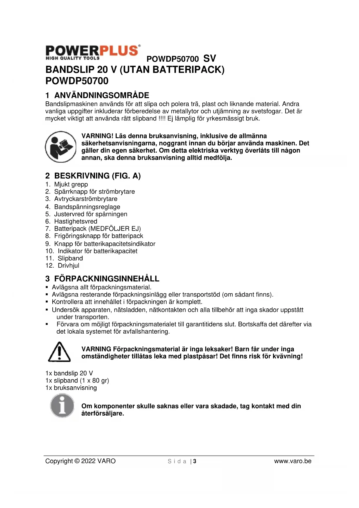 VARO – Vic. Van Rompuy N.V. – Joseph Van Instraat 9 – BE2500 Lier – Belgien, deklarerar härmed att, Produkt: Bandslip 20 V – Batteridriven Varumärke: PowerPlus Modell: POWDP50700 överensstämmer med väsentliga krav och andra relevanta bestämmelser i tillämpliga europeiska direktiv, baserat på tillämpningen av europeiska harmoniserade standarder. Varje ej godkänd ändring av apparaten gör denna deklaration ogiltig. Europeiska direktiv (inklusive, i tillämpliga fall, ändringar till dessa, fram till dagen för undertecknandet): 2011/65/EU 2006/42/EC 2014/30/EU Europeiska harmoniserade standarder (inklusive, i tillämpliga fall, ändringar till dessa, fram till dagen för undertecknandet): EN62841-1: 2015 EN62841-2-4: 2014 EN55014-1: 2017 EN55014-2: 2015 Ansvarig för den tekniska dokumentationen: Philippe Vankerkhove, VARO - Vic. Van Rompuy N.V. Undertecknad agerar på uppdrag av företagets VD, Ludo Mertens Certifieringschef 01/10/2021, Lier - BelgienPOWDP50700 FI Copyright © 2022 VARO S i v u | 1 www.varo.be 1 KÄYTTÖ ............................................................................................... 3